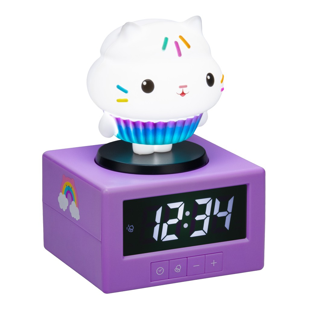 Gabby budík je navržen jako veselý a hravý pomocník pro děti, který jim usnadní vstávání každé ráno. Jeho hlavní součástí je fialový základ ve tvaru krychle, na kterém je umístěna postavička ve tvaru roztomilého kočičího cupcakes. Tato figurka je bílá s barevnými zdobeními připomínajícími posyp na sladkém dezertu, což dodává budíku příjemný a hravý vzhled vhodný do dětského pokoje. Na boku základny je pak veselá nálepka duha s mráčky, která podtrhuje hravost celého designu. Digitální displej na přední straně budíku je přehledný a dobře čitelný díky velkým bílým číslicím na černém pozadí. Pod displejem se nachází ovládací tlačítka, která umožňují nastavení času a budíku, stejně jako aktivaci nočního světla. Unikátní funkcí je možnost odložení budíku nebo zapnutí nočního světla jednoduchým poklepáním na hlavu postavičky Gabby. Toto praktické řešení je ideální pro děti, které si tak mohou samy snadno odložit budík nebo rozsvítit jemné světlo. Budík je napájen třemi bateriemi typu AA, které nejsou součástí balení, což umožňuje flexibilní použití bez nutnosti stálého připojení k elektrické síti. Díky kompaktním rozměrům a stabilnímu podstavci je Gabby budík vhodný na noční stolek, kde může být nejen praktickým pomocníkem při vstávání, ale i milým doplňkem dětského pokoje. Celkově je tento budík skvělou volbou pro rodiče, kteří hledají zábavný a funkční produkt, který dětem zpříjemní ranní vstávání.