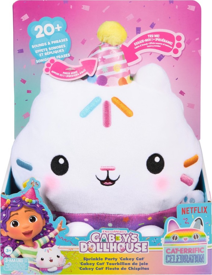 S plyšovou hračkou Dortě můžete zažívat nezapomenutelná herní dobrodružství z kouzelného domku! Tato interaktivní plyšová hračka kočičky Dortě je oblečena ve svém exkluzivním oblečení s motivem oslav! Otočte Dortě vzhůru nohama, abyste vstoupili do ztřeštěného režimu, zatřeste s ním, abyste vstoupili do párty režimu, a stiskněte tlačítko na jeho party klobouku, abyste aktivovali režim mluvení! Dortě měří 25 cm, což z něj dělá perfektního společníka na zábavu během hraní i snění při spánku! Hračky Gábinin kouzelný domek pro dívky a chlapce jsou skvělými dárky pro všechny děti, které jsou fanoušky tohoto seriálového hitu od Netflixu a rádi si hrají s domečky pro panenky. Zajistěte jim nezapomenutelný zážitek se světem roztomilých figurek, doplňků a nábytku do kouzelného domku, které mohou sbírat a libovolně skládat! Postavte si vlastní svět se základními stavebnicemi, jako je kuchyňka na hraní nebo hudební místnost, a spoustou sběratelských předmětů, jako je úžasná výletní loď, bazén pro mořské panny nebo zbrusu nová souprava Párty pokoj – podkroví kouzelného domku s krytým skateparkem a roztomiloučkými balkónky s mini antistresovými hračkami, které poskytují uspokojivou senzorickou hru a lze je bezproblémově zkombinovat s oběma verzemi kouzelného domku!