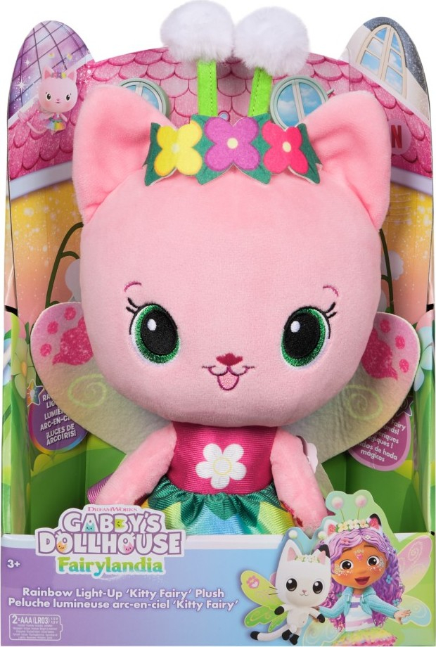 Vneste k sobě domů kouzlo Gábinina kouzelného domku a dopřejte svému dítěti pestrobarevnou dávku magie s roztomilou duhově svítící plyšovou Víla Kočičkou! Tato 35centimetrová plyšová Víla Kočička září v duhových barvách, s jemnými vílími křídly, hravými bambulkami na pružinkách zdobenými květinovou korunkou a krásnými duhovými šaty s květinou, která se rozsvěcí různými barvami pro extra smyslové hraní. Jemným stisknutím tlapky se květina uprostřed jejích šatů rozsvítí jednou ze šesti třpytivých barev a vykouzlí mňau-úžasnou atmosféru – ideální pro uklidnění před spaním nebo probuzení fantazie při hře. Každé měkounké, mačkací plyšové zvířátko umožní fanouškům Gábinina kouzelného domku znovu vytvářet vlastní hebké příběhy a přehrávat oblíbené scény ze seriálu s nekonečnými možnostmi vyprávění. Hračky z Gábinina kouzelného domku jsou dokonalým dárkem pro děti, které chtějí znovu prožít své oblíbené okamžiky z pohádkového světa Gábi. Ať už vytvářejí nová dobrodružství s hračkami pro nejmenší, převlékacími doplňky, nábytkem do kouzelného domečku, mňau-úžasnými kočičími kamarády nebo fantastickými mořskými hračkami, naše měkoučké plyšové hračky jsou roztomilou dekorací do pokojíčku a skvělým dárkem pro každou holčičku i fanouška, protože zvou k nekonečným kočičím dobrodružstvím! Vhodné pro děti od 3 let. Pouze ruční praní.