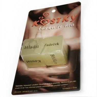 Jestliže Váš sexuální život zevšedněl, je třeba ho trochu popostrčit. Pořiďte si hrací kostky, která Vám přichystají mnoho krásných zážitků. Stačí jen hodit a řídit se podle kombinaci dvou slov, která na kostce padnou. Otevře se Vám nová dimenze zážitků v ložnici. rozměr kostky: 1,5x1,5x1,5 cm velikost balení: 16 x 9 x 2 cm