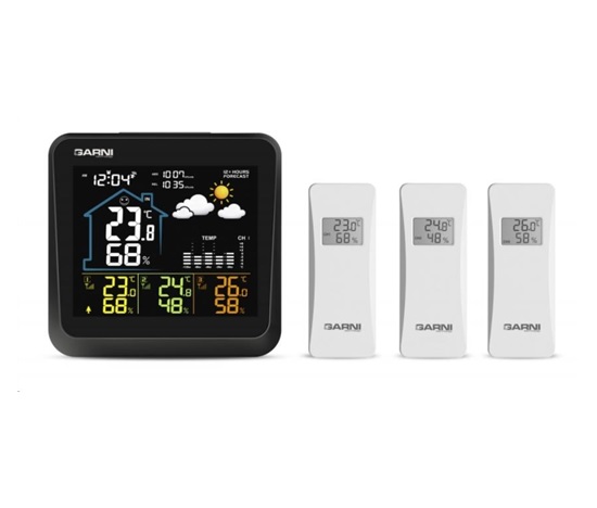 Napájení:Síťový zdroj + Baterie; Funkce Meteostanic a teploměrů:Osvětlení displeje, Hodiny