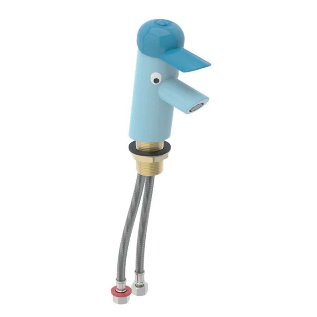 Umyvadlová armatura Geberit Bambini, 1-pákový směšovač k odběru pitné vody vhodné do dětských zařízení pro montáž do umyvadla nebo panelů s umyvadlem k osazení do hracích a mycích ploch Bambini pro připojení přívodu studené i teplé vody Vlastnosti provedení: oceánsky modrá, světle modrá design vhodný pro děti skupina armatur I podle DIN 4109 páková baterie omezení průtoku usměrňovačem proudu vody se zabudovaným zpětným ventilem rukojeť z ABS provozní tlak 100–1000 kPa maximální zkušební tlak vody 1600 kPa maximální zkušební tlak vzduchu / inertního plynu 300 kPa maximální teplota vody: 65 °C maximální teplota vody, krátkodobá: 90 °C průtok při tlaku 3 bar: 5.7 l/min materiál: mosaz Obsah dodávky klíč pro usměrňovač proudu vody klíč pro páku upevňovací materiál Aby se zabránilo opaření, doporučuje se použití minitermostatu k umyvadlovým armaturám Geberit Bambini.