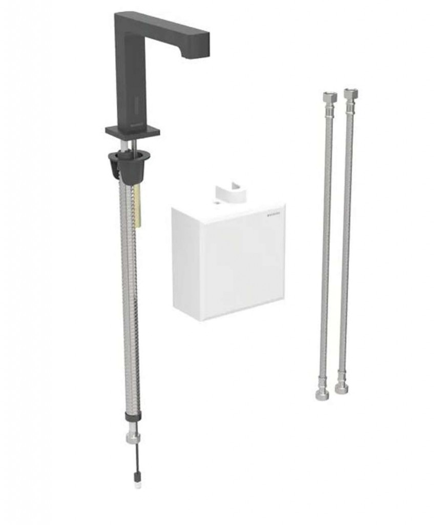 Elektronická umyvadlová armatura Brenta se směšovačem, pro funkční box na omítku Barva matná černá Materiál: mosaz pochromovaná/plast K odběru pitné vody Pro veřejný a poloveřejný sektor Pro montáž do umyvadla nebo panelů s umyvadlem Pro připojení studené a teplé vody / studené a smíchané vody Pro použití s nerezovými dřezy Nanesený povrch easy-to-clean Pro průtok > 3 l/min Provedení se směšovačem není určeno pro průtokový ohřívač Skupina armatur I podle DIN 4109 Automatické spuštění vody Samonastavitelný infračervené čidlo pro zaznamenání uživatele Odolný proti vandalům Omezení průtoku usměrňovačem proudu vody Nastavení teploty přes směšovač Voda nastavitelná jako ne pouze teplá nebo ne pouze studená Napájení elektrickým proudem z generátoru a akumulátoru Výstraha při nízkém stavu nabití akumulátoru Ekonomický režim provozu nastavitelný Úspora vody díky dvouproudové snímací technice s rychlou reakcí Funkce je možné servisním dálkovým ovládáním nastavit a dotazovat Program úspora vody nastavitelný Program intervalu propláchnutí nastavitelný Trvalé propláchnutí individuálně nastavitelné Ovládání spouštění deaktivovatelné pomocí ovládání pro údržbu Geberit Různé funkce ručně nastavitelné Se zabudovaným zpětným ventilem Funkční jednotka se zabudovanými košíkovými filtry Technické údaje Druh ochrany: IPX4 Provozní napětí: 3,2 V DC Provozní tlak: 200-1000 kPa Rozdíl tlaku studená/teplá voda: ≤ 150 kPa Maximální zkušební tlak vody: 1600 kPa Maximální zkušební tlak vzduchu/inertního plynu: 300 kPa Teplota okolí: 1–40 °C Teplota skladování: -20 – +70 °C Maximální teplota vody: 60 °C Maximální teplota vody, krátkodobá: 90 °C Průtok při tlaku 3 bar: 5 l/min Výpočtový průtok: 0.07 l/s Minimální přetlak pro výpočtový průtok: 200 kPa Interval proplachu, rozsah nastavení: 1-168 h Interval spláchnutí, nastavení ve výrobě: 24 h Interval proplachu, rozsah nastavení: 5-200 s Interval spláchnutí, nastavení ve výrobě: 5 s Délka výtoku: 195 mm Výška baterie: 161 mm Komfortní zóna: 128 mm Obsah dodávky Umyvadlová armatura s infračerveným senzorem a hadicí pro přívod vody Funkční box na omítku s řídicí elektronikou, funkční jednotkou a akumulátorem pro provoz generátoru Pancéřové hadičky 3/8" Klíč pro usměrňovač proudu vody Upevňovací materiál