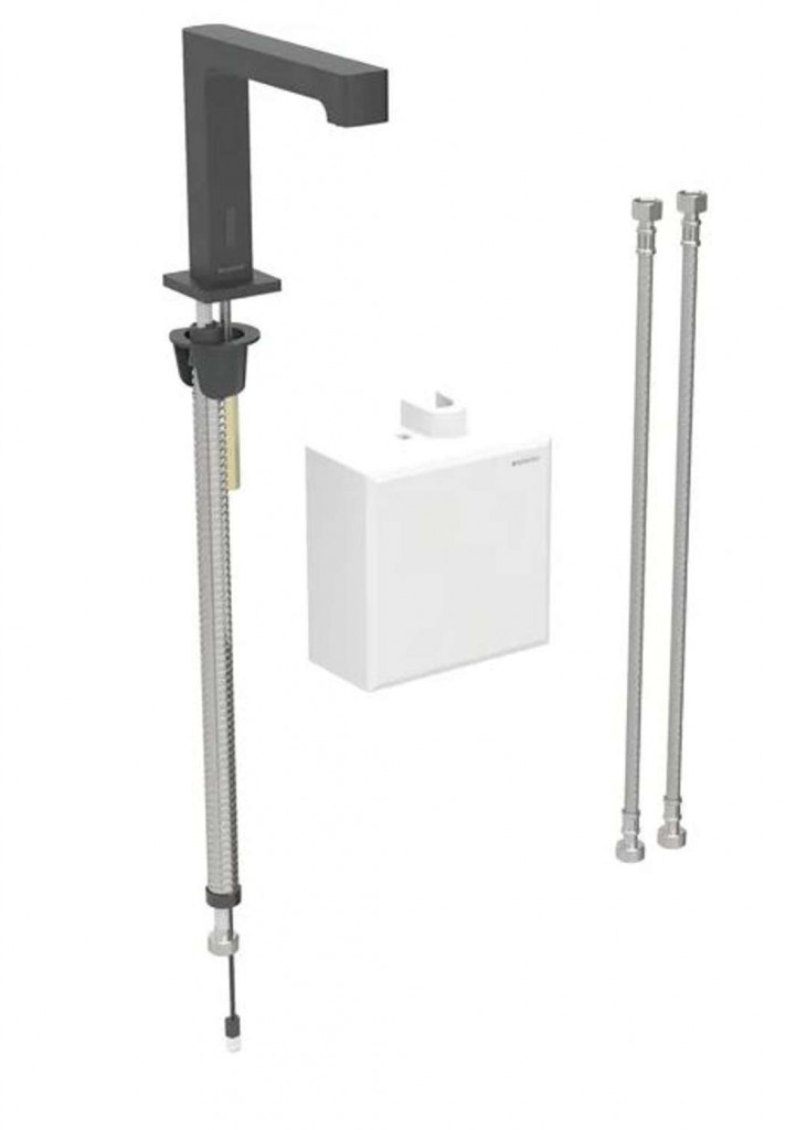 Elektronická umyvadlová armatura Brenta bez směšovače, pro funkční box na omítku Barva matná černá Materiál mosaz pochromovaná/plast K odběru pitné vody Pro veřejný a poloveřejný sektor Pro montáž do umyvadla nebo panelů s umyvadlem Pro připojení studené a teplé vody / studené a smíchané vody Pro použití s nerezovými dřezy Provedení se směšovačem není určeno pro průtokový ohřívač Skupina armatur I podle DIN 4109 Automatické spuštění vody Infračervené čidlo pro zaznamenání uživatele Odolný proti vandalům Nanesena vrstva easy-to-clean Omezení průtoku usměrňovačem proudu vody Nastavení teploty přes směšovač Voda nastavitelná jako ne pouze teplá nebo ne pouze studená Napájení z baterie Výstraha v případě slabé baterie Úspora vody díky dvouproudové snímací technice s rychlou reakcí Funkce je možné servisním dálkovým ovládáním nastavit a dotazovat Ovládání spouštění deaktivovatelné pomocí ovládání pro údržbu Geberit Různé funkce ručně nastavitelné (interval propláchnutí, úspora vody, propláchnutí, ekonomický režim) Se zabudovaným zpětným ventilem Funkční jednotka se zabudovanými košíkovými filtry Technické údaje Typ baterie: Alkalická baterie (1.5 V AA) Druh ochrany: IPX4 Provozní napětí: 3 V DC Provozní tlak: 50-1000 kPa Rozdíl tlaku studená/teplá voda: ≤ 150 kPa Maximální zkušební tlak vody: 1600 kPa Maximální zkušební tlak vzduchu/inertního plynu: 300 kPa Teplota okolí: 1–40 °C Teplota skladování: -20 – +70 °C Maximální teplota vody: 60 °C Maximální teplota vody, krátkodobá: 90 °C Průtok při tlaku 3 bar: 5 l/min Výpočtový průtok: 0,07 l/s Minimální přetlak pro výpočtový průtok: 50 kPa Interval proplachu, rozsah nastavení: 1-168 h Interval spláchnutí, nastavení ve výrobě: 24 h Interval proplachu, rozsah nastavení: 5-200 s Interval spláchnutí, nastavení ve výrobě: 5 s Délka výtoku: 195 mm Výška baterie: 161 mm Komfortní zóna: 128 mm Obsah dodávky Umyvadlová armatura s infračerveným senzorem a hadicí pro přívod vody Funkční box na omítku s řídicí elektronikou, funkční jednotkou a pouzdrem na baterie Pancéřové hadičky 3/8" Klíč pro usměrňovač proudu vody Upevňovací materiál Ilustrační foto