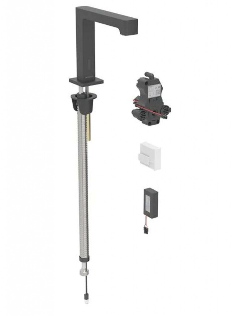Elektronická umyvadlová armatura Brenta bez směšovače, pro funkční box pod omítku Barva matná černá Materiál Mosaz pochromovaná/plast K odběru pitné vody Pro veřejný a poloveřejný sektor Pro montáž do umyvadla nebo panelů s umyvadlem K montáži do instalačních prvků Geberit pro umyvadlo, stojánková armatura s funkčním boxem pod omítku K montáži do souprav pro hrubou montáž k umyvadlovým armaturám Geberit, stojánkové, s funkčním boxem pod omítku Pro připojení studené a smíchané vody Pro použití s nerezovými dřezy Skupina armatur I podle DIN 4109 Automatické spuštění vody Samonastavitelné infračervené čidlo pro zaznamenání uživatele Odolný proti vandalům Nanesený povrch easy-to-clean Omezení průtoku usměrňovačem proudu vody Napájení z baterie Výstraha v případě slabé baterie Ekonomický režim provozu nastavitelný Úspora vody díky dvouproudové snímací technice s rychlou reakcí Funkce je možné servisním dálkovým ovládáním nastavit a dotazovat Program úspora vody nastavitelný Program intervalu propláchnutí nastavitelný Trvalé propláchnutí individuálně nastavitelné Ovládání spouštění deaktivovatelné pomocí ovládání pro údržbu Geberit Různé funkce ručně nastavitelné Se zabudovaným zpětným ventilem Funkční jednotka se zabudovanými košíkovými filtry Technické údaje Typ baterie: Alkalická baterie (1,5 VAA) Druh ochrany: IPX4 Provozní napětí: 3 V DC Provozní tlak: 50 - 1000 kPa Rozdíl tlaku studená/teplá voda: ≤ 150 kPa Maximální zkušební tlak vody: 1 600 kPa Maximální zkušební tlak vzduchu/inertního plynu: 300 kPa Teplota okolí: 1 – 40 °C Teplota skladování: -20 – +70 °C Maximální teplota vody: 60 °C Maximální teplota vody, krátkodobá: 90 °C Průtok při tlaku: 3 bar 5 l/min Výpočtový průtok: 0,07 l/s Minimální přetlak pro výpočtový průtok: 50 kPa Interval proplachu, rozsah nastavení: 1 - 168 h Interval spláchnutí, nastavení ve výrobě: 24 h Interval proplachu, rozsah nastavení: 5 - 200 s Interval spláchnutí, nastavení ve výrobě: 5 s Délka výtoku: 195 mm Výška baterie: 161 mm Komfortní zóna: 128 mm Obsah dodávky Umyvadlová armatura s infračerveným senzorem a hadicí pro přívod vody Řídicí elektronika Funkční jednotka Pouzdro na baterie 2 alkalické manganové baterie typu AA, 1,5 V Klíč pro usměrňovač proudu vody Upevňovací materiál