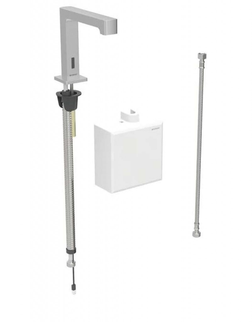 Elektronická umyvadlová armatura bez směšovače, pro funkční box na omítku Barva kartáčovaná nerez Materiál mosaz pochromovaná/plast K odběru pitné vody Pro veřejný a poloveřejný sektor Pro montáž do umyvadla nebo panelů s umyvadlem Pro použití s nerezovými dřezy Nanesen povrch easy-to-clean Pro průtok > 3 l/min Provedení se směšovačem není určeno pro průtokový ohřívač Skupina armatur I podle DIN 4109 Automatické spuštění vody Samonastavitelné infračervené čidlo pro zaznamenání uživatele Odolný proti vandalům Omezení průtoku usměrňovačem proudu vody Napájení elektrickým proudem z generátoru a akumulátoru Výstraha při nízkém stavu nabití akumulátoru Ekonomický režim provozu nastavitelný Úspora vody díky dvouproudové snímací technice s rychlou reakcí Funkce je možné servisním dálkovým ovládáním nastavit a dotazovat Program úspora vody nastavitelný Program intervalu propláchnutí nastavitelný Trvalé propláchnutí individuálně nastavitelné Ovládání spouštění deaktivovatelné pomocí ovládání pro údržbu Geberit Různé funkce ručně nastavitelné Se zabudovaným zpětným ventilem Funkční jednotka se zabudovanými košíkovými filtry Technické údaje Druh ochrany: IPX4 Provozní napětí: 3,2 V DC Provozní tlak: 200 - 1000 kPa Rozdíl tlaku studená/teplá voda: ≤ 150 kPa Maximální zkušební tlak vody: 1 600 kPa Maximální zkušební tlak vzduchu/inertního plynu: 300 kPa Teplota okolí: 1 – 40 °C Teplota skladování: -20 – +70 °C Maximální teplota vody: 60 °C Maximální teplota vody, krátkodobá: 90 °C Průtok při tlaku 3 bar: 5 l/min Výpočtový průtok: 0,07 l/s Minimální přetlak pro výpočtový průtok: 200 kPa Interval proplachu, rozsah nastavení: 1 - 168 h Interval spláchnutí, nastavení ve výrobě: 24 h Interval proplachu, rozsah nastavení: 5 - 200 s Interval spláchnutí, nastavení ve výrobě: 5 s Obsah dodávky Umyvadlová armatura s infračerveným senzorem a hadicí pro přívod vody Funkční box na omítku s řídicí elektronikou, funkční jednotkou a akumulátorem pro provoz generátoru Pancéřové hadičky 3/8" Klíč pro usměrňovač proudu vody Upevňovací materiál Ilustrační foto