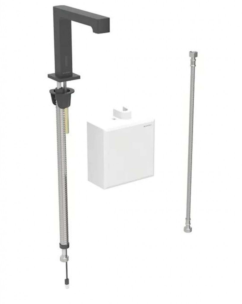 Elektronická umyvadlová armatura bez směšovače, pro funkční box na omítku Barva matná černá Materiál mosaz pochromovaná/plast K odběru pitné vody Pro veřejný a poloveřejný sektor Pro montáž do umyvadla nebo panelů s umyvadlem Pro použití s nerezovými dřezy Nanesen povrch easy-to-clean Pro průtok > 3 l/min Skupina armatur I podle DIN 4109 Automatické spuštění vody Samonastavitelné infračervené čidlo pro zaznamenání uživatele Odolný proti vandalům Omezení průtoku usměrňovačem proudu vody Napájení elektrickým proudem z generátoru a akumulátoru Výstraha při nízkém stavu nabití akumulátoru Ekonomický režim provozu nastavitelný Úspora vody díky dvouproudové snímací technice s rychlou reakcí Funkce je možné servisním dálkovým ovládáním nastavit a dotazovat Program úspora vody nastavitelný Program intervalu propláchnutí nastavitelný Trvalé propláchnutí individuálně nastavitelné Ovládání spouštění deaktivovatelné pomocí ovládání pro údržbu Geberit Různé funkce ručně nastavitelné Se zabudovaným zpětným ventilem Funkční jednotka se zabudovanými košíkovými filtry Technické údaje Druh ochrany: IPX4 Provozní napětí: 3,2 V DC Provozní tlak: 200 - 1000 kPa Rozdíl tlaku studená/teplá voda: ≤ 150 kPa Maximální zkušební tlak vody: 1 600 kPa Maximální zkušební tlak vzduchu/inertního plynu: 300 kPa Teplota okolí: 1 – 40 °C Teplota skladování: -20 – +70 °C Maximální teplota vody: 60 °C Maximální teplota vody, krátkodobá: 90 °C Průtok při tlaku 3 bar: 5 l/min Výpočtový průtok: 0,07 l/s Minimální přetlak pro výpočtový průtok: 200 kPa Interval proplachu, rozsah nastavení: 1 - 168 h Interval spláchnutí, nastavení ve výrobě: 24 h Interval proplachu, rozsah nastavení: 5 - 200 s Interval spláchnutí, nastavení ve výrobě: 5 s Délka výtoku: 195 mm Výška baterie: 161 mm Komfortní zóna: 128 mm Obsah dodávky Umyvadlová armatura s infračerveným senzorem a hadicí pro přívod vody Funkční box na omítku s řídicí elektronikou, funkční jednotkou a akumulátorem pro provoz generátoru Pancéřové hadičky 3/8" Klíč pro usměrňovač proudu vody Upevňovací materiál Ilustrační foto