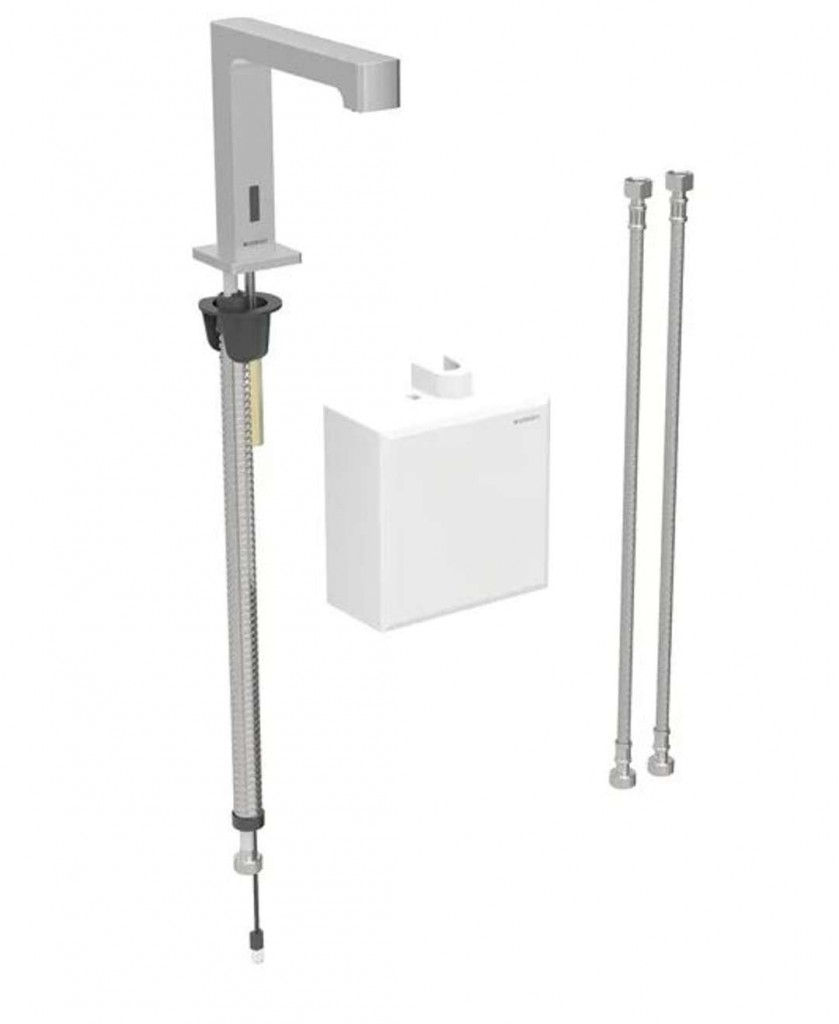 Elektronická baterie, s termostatickým směšovačem, s funkčním boxem na omítku barva kartáčovaná nerez materiál pochromovaná mosaz / plast k odběru pitné vody pro veřejný a poloveřejný sektor pro montáž do umyvadla nebo panelů s umyvadlem pro připojení studené a teplé vody / studené a smíchané vody pro použití s nerezovými dřezy model se směšovačem nebo termostatickým směšovačem není vhodný pro průtokový ohřívač napájení z baterie skupina armatur I podle DIN 4109 termostat dle EN 1111 automatické spuštění vody infračervené čidlo pro zaznamenání uživatele odolný proti vandalům omezení průtoku usměrňovačem proudu vody nastavení teploty přes směšovač voda nastavitelná jako ne pouze teplá nebo ne pouze studená ochrana proti opaření omezením teploty vody na 42 °C možnost tepelné dezinfekce dle DVGW W 551 baterie stačí pro cca 200 000 spuštění výstraha v případě slabé baterie úspora vody díky dvouproudové snímací technice s rychlou reakcí funkce je možné servisním dálkovým ovládáním nastavit a dotazovat ovládání spouštění deaktivovatelné pomocí ovládání pro údržbu Geberit různé funkce ručně nastavitelné (program úspora vody, program intervalu propláchnutí, trvalé propláchnutí, ekonomický režim) se zabudovaným zpětným ventilem funkční jednotka se zabudovanými košíkovými filtry Technické údaje výška baterie 161 mm komfortní zóna 128 mm typ baterie Alkalická baterie (1,5 V AA) druh ochrany IPX4 provozní napětí 3 V DC provozní tlak 50 - 1000 kPa doporučený provozní tlak s termostatickým směšovačem 0,5 - 5 bar doporučený provozní tlak s termostatickým směšovačem 50 - 500 kPa rozdíl tlaku studená/teplá voda ≤ 150 kPa maximální zkušební tlak vody 1600 kPa maximální zkušební tlak vzduchu / inertního plynu 300 kPa teplota okolí 1–40 °C teplota skladování -20 – +70 °C teplota vody - rozsah nastavení s termostatickým směšovačem 20 - 42 °C maximální teplota vody 60 °C maximální teplota vody, krátkodobá 90 °C průtok při tlaku 3 bar 5 l/min výpočtový průtok 0,07 l/s minimální přetlak pro výpočtový průtok 50 kPa interval proplachu, rozsah nastavení 1 - 168 h interval spláchnutí, nastavení ve výrobě 24 h interval proplachu, rozsah nastavení 5 - 200 s interval spláchnutí, nastavení ve výrobě 5 s Délka výtoku: 195 mm Výška baterie: 161 mm Komfortní zóna: 128 mm Obsah dodávky umyvadlová armatura s infračerveným senzorem a hadicí pro přívod vody řídicí elektronika funkční jednotka pouzdro pro baterii 2 alkalické manganové baterie typu AA, 1,5 V klíč pro usměrňovač proudu vody upevňovací materiál Prvek Geberit pro umyvadlo nebo souprava pro hrubou montáž k umyvadlové armatuře Geberit a krycí deska nejsou součástí dodávky.