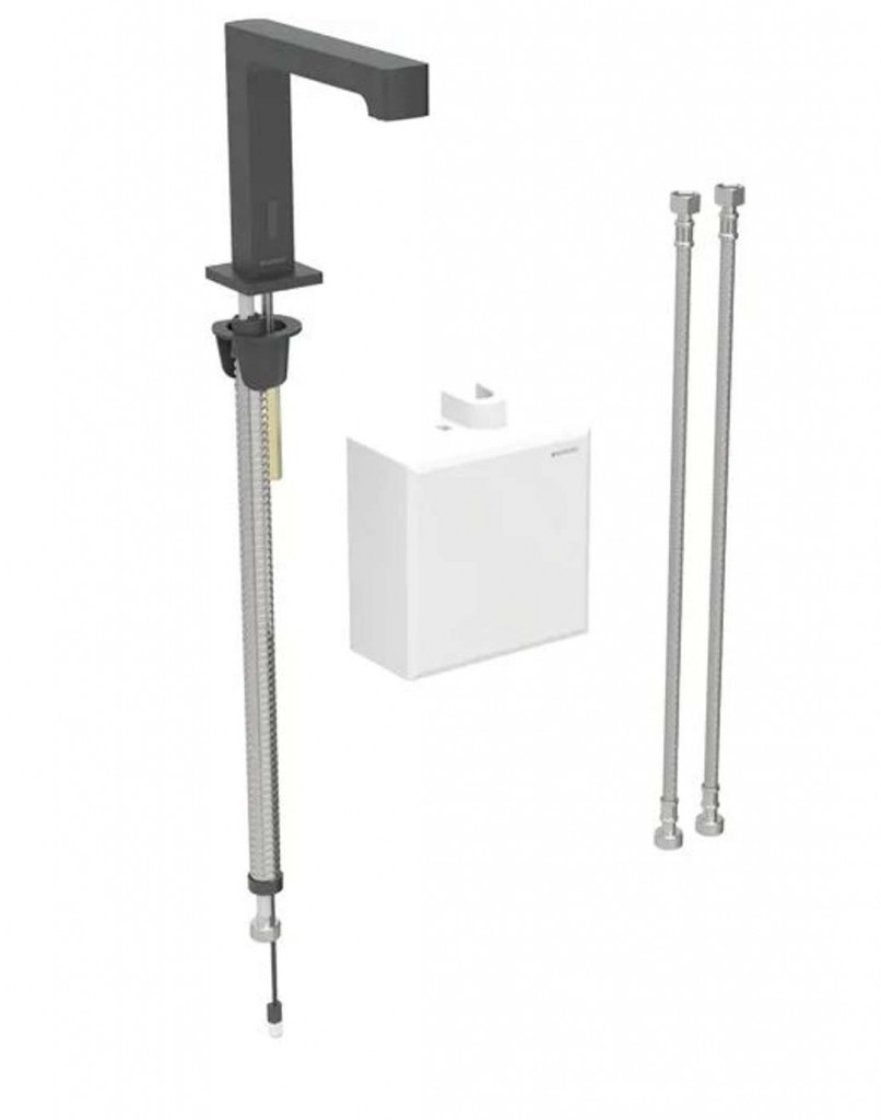 Elektronická baterie, s termostatickým směšovačem, s funkčním boxem na omítku barva matná černá materiál pochromovaná mosaz / plast k odběru pitné vody pro veřejný a poloveřejný sektor pro montáž do umyvadla nebo panelů s umyvadlem pro připojení studené a teplé vody / studené a smíchané vody pro použití s nerezovými dřezy model se směšovačem nebo termostatickým směšovačem není vhodný pro průtokový ohřívač napájení z baterie skupina armatur I podle DIN 4109 termostat dle EN 1111 automatické spuštění vody infračervené čidlo pro zaznamenání uživatele odolný proti vandalům omezení průtoku usměrňovačem proudu vody nastavení teploty přes směšovač voda nastavitelná jako ne pouze teplá nebo ne pouze studená ochrana proti opaření omezením teploty vody na 42 °C možnost tepelné dezinfekce dle DVGW W 551 baterie stačí pro cca 200 000 spuštění výstraha v případě slabé baterie úspora vody díky dvouproudové snímací technice s rychlou reakcí funkce je možné servisním dálkovým ovládáním nastavit a dotazovat ovládání spouštění deaktivovatelné pomocí ovládání pro údržbu Geberit různé funkce ručně nastavitelné (program úspora vody, program intervalu propláchnutí, trvalé propláchnutí, ekonomický režim) se zabudovaným zpětným ventilem funkční jednotka se zabudovanými košíkovými filtry Technické údaje výška baterie 161 mm komfortní zóna 128 mm typ baterie Alkalická baterie (1,5 V AA) druh ochrany IPX4 provozní napětí 3 V DC provozní tlak 50 - 1000 kPa doporučený provozní tlak s termostatickým směšovačem 0,5 - 5 bar doporučený provozní tlak s termostatickým směšovačem 50 - 500 kPa rozdíl tlaku studená/teplá voda ≤ 150 kPa maximální zkušební tlak vody 1600 kPa maximální zkušební tlak vzduchu / inertního plynu 300 kPa teplota okolí 1–40 °C teplota skladování -20 – +70 °C teplota vody - rozsah nastavení s termostatickým směšovačem 20 - 42 °C maximální teplota vody 60 °C maximální teplota vody, krátkodobá 90 °C průtok při tlaku 3 bar 5 l/min výpočtový průtok 0,07 l/s minimální přetlak pro výpočtový průtok 50 kPa interval proplachu, rozsah nastavení 1 - 168 h interval spláchnutí, nastavení ve výrobě 24 h interval proplachu, rozsah nastavení 5 - 200 s interval spláchnutí, nastavení ve výrobě 5 s Délka výtoku: 195 mm Výška baterie: 161 mm Komfortní zóna: 128 mm Obsah dodávky umyvadlová armatura s infračerveným senzorem a hadicí pro přívod vody řídicí elektronika funkční jednotka pouzdro pro baterii 2 alkalické manganové baterie typu AA, 1,5 V klíč pro usměrňovač proudu vody upevňovací materiál Prvek Geberit pro umyvadlo nebo souprava pro hrubou montáž k umyvadlové armatuře Geberit a krycí deska nejsou součástí dodávky.