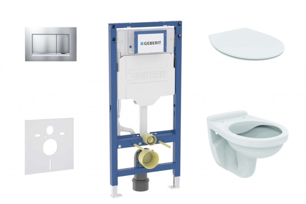 Set předstěnové instalace, klozetu a sedátka Ideal Standard, tlačítka Sigma30, chrom mat/chrom Obsahuje předstěnový instalační prvek Geberit Duofix, se splachovací nádržkou pod omítku soupravu pro tlumení hluku keramický závěsný klozet Ideal Standard Alpha duroplastové WC sedátko Ideal Standard SoftClose pozvolné, tiché sklápění 2-činné ovládací tlačítko Geberit Sigma30, barva: chrom mat/chrom stavební souprava pro předstěnovou montáž není součástí dodávky, je třeba objednat zvlášť Tento instalační set je dostupný v dalších variantách provedení ovládacího tlačítka. Montážní prvek Duofix pro závěsné WC se splachovací nádržkou pod omítku Sigma 12 cm Účel použití pro konstrukce prováděné suchým procesem k montáži do předstěnových instalací částečně vysokých nebo vysokých na výšku místnosti k montáži do instalačních stěn vysokých na výšku místnosti k montáži do systémových stěn Geberit Duofix částečně vysokých nebo vysokých na výšku místnosti pro závěsná WC s připojovacími rozměry podle EN 33 a přesahem do 70 cm pro 1-činné, 2 -činné nebo Start/Stop splachování pro tloušťky podlahy 0–25 cm Vlastnosti samonosný rám s nanesenou práškovou barvou rám připravený pro podpěry u WC keramik s malou opěrnou plochou podpěry pozinkované podpěry s protiskluzovou úpravou patní desky otočné, vhodné pro montáž do U-profilů UW 50 a UW 75 připojovací koleno pro montáž bez nářadí v různých hloubkách, rozsah nastavení 45 mm splachovací nádržka pod omítku izolovaná proti orosování u nastavení z výroby je možné okamžité dodatečné spláchnutí montážní a servisní práce na splachovací nádržce pod omítku bez nářadí přívod vody vzadu nebo nahoře uprostřed kryt pro hrubou montáž pro servisní otvor chrání před vlhkostí a nečistotami kryt pro hrubou montáž pro servisní otvor s možností zkrácení vybaven trubkovou chráničkou pro přívodní potrubí k připojení sprchovacích WC Geberit AquaClean s možností upevnění pro přívod elektřiny Technické údaje tlak při průtoku: 10-1000 kPa maximální teplota vody: 25 °C splachovací množství, nastavení ve výrobě: 6 a 3 l velké splachovací množství, rozsah nastavení: 4 / 4.5 / 6 / 7.5 l malé splachovací množství, rozsah nastavení: 2-4 l výpočtový průtok: 0.09 l/s minimální přetlak pro výpočtový průtok: 10 kPa Obsah dodávky přívod vody R 1/2", vhodný pro MF, s integrovaným rohovým ventilem a ručním ovládacím kolečkem kryt pro hrubou montáž pro servisní otvor připojovací souprava pro WC, Ø 90 mm připojovací koleno 90° z PE-HD, Ø 90 mm přechodka z PE-HD, Ø 90 / 110 mm upevňovací materiál Stavební souprava pro předstěnovou montáž není součástí balení. Závěsný klozet Ideal Standard Alpha rozměry: 355 x 520 mm materiál: sanitární keramika Rimless splachovací technologie Klozetové sedátko s funkcí pomalého sklápění Soft-close materiál: duroplast barva: bílá plastové panty Ovládací tlačítko Sigma30, pro 2 množství splachování rozměry: 246 x 164 mm materiál: plast barva provedení: chrom mat/chrom k ovládání splachování u splachovacích nádržek pod omítku Geberit Sigma upevňovací rámeček 2 stavitelné úchytky 2 tyčky tlačítka tyčky tlačítka jsou zvukově izolované, rychlé nastavení bez nářadí