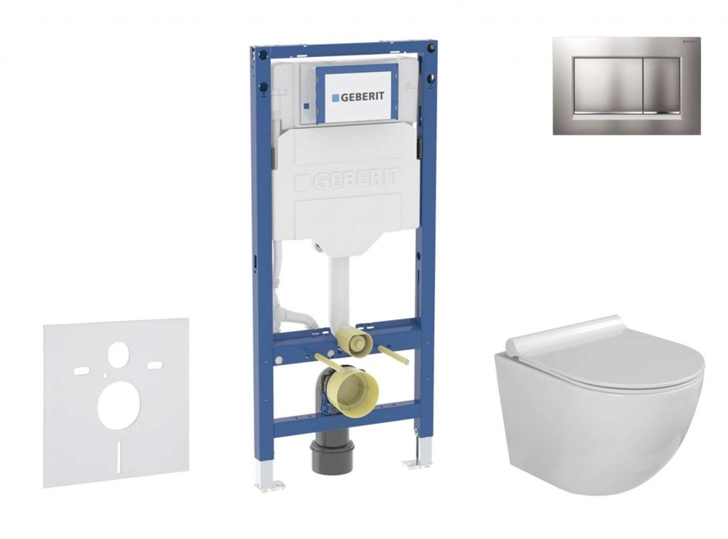 Set obsahuje předstěnový instalační modul Geberit Duofix se splachovací nádržkou pod omítku kompaktní závěsný klozet kielle Gaia se sedátkem SoftClose ovládací tlačítko Geberit Sigma30 pro 2-činné splachování soupravu pro tlumení hluku Předstěnový instalační modul Duofix pro závěsné WC se splachovací nádržkou Sigma 12 cm pro konstrukce prováděné suchým procesem k montáži do předstěnových instalací částečně vysokých nebo vysokých na výšku místnosti k montáži do instalačních stěn vysokých na výšku místnosti k montáži do systémových stěn Geberit Duofix částečně vysokých nebo vysokých na výšku místnosti pro závěsná WC s připojovacími rozměry podle EN 33 a přesahem do 70 cm pro 1-činné, 2 -činné nebo Start/Stop splachování pro tloušťky podlahy 0–25 cm Vlastnosti samonosný rám s nanesenou práškovou barvou rám připravený pro podpěry u WC keramik s malou opěrnou plochou podpěry pozinkované podpěry s protiskluzovou úpravou patní desky otočné, vhodné pro montáž do U-profilů UW 50 a UW 75 připojovací koleno pro montáž bez nářadí v různých hloubkách, rozsah nastavení 45 mm splachovací nádržka pod omítku izolovaná proti orosování u nastavení z výroby je možné okamžité dodatečné spláchnutí montážní a servisní práce na splachovací nádržce pod omítku bez nářadí přívod vody vzadu nebo nahoře uprostřed kryt pro hrubou montáž pro servisní otvor chrání před vlhkostí a nečistotami kryt pro hrubou montáž pro servisní otvor s možností zkrácení vybaven trubkovou chráničkou pro přívodní potrubí k připojení sprchovacích WC Geberit AquaClean s možností upevnění pro přívod elektřiny Technické údaje tlak při průtoku: 10-1000 kPa maximální teplota vody: 25 °C splachovací množství, nastavení ve výrobě: 6 a 3 l velké splachovací množství, rozsah nastavení: 4 / 4.5 / 6 / 7.5 l malé splachovací množství, rozsah nastavení: 2-4 l výpočtový průtok: 0.09 l/s minimální přetlak pro výpočtový průtok: 10 kPa Obsah dodávky přívod vody R 1/2", vhodný pro MF, s integrovaným rohovým ventilem a ručním ovládacím kolečkem kryt pro hrubou montáž pro servisní otvor připojovací souprava pro WC, Ø 90 mm připojovací koleno 90° z PE-HD, Ø 90 mm přechodka z PE-HD, Ø 90 / 110 mm upevňovací materiál Kompaktní závěsné WC Gaia barva: bílá rozměry: 360 x 485 mm Rimless bezokrajové provedení skryté upevnění hluboké splachování splachovací objem 4/6 l WC sedátko barva: bílá s funkcí pomalého sklápění SoftClose lehce odnímatelné pro snadnou údržbu Ovládací tlačítko Sigma30, pro 2-činné splachování k ovládání splachování u splachovacích nádržek pod omítku Geberit Sigma ovládání zepředu tyčky tlačítka zvukově izolované, rychlé nastavení bez nářadí rozměry: 246 x 164 mm materiál: plast provedení desky a tlačítek: matný chrom lakovaný, vrstva easy-to-clean, designový proužek: lesklý chrom ovládací síla: < 20 N obsahuje: upevňovací rámeček, 2 stavitelné úchytky, 2 tyčky tlačítka Protihluková sada pro závěsné WC nebo závěsný bidet pro montáž keramiky se vzdáleností upevnění 18 cm nebo 23 cm přerušuje přenos hluku u WC a bidetu materiál: polyetylén-pěna obsahuje: 1x zvukově izolační vložku, 2x podložku