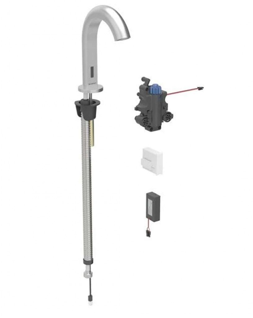Elektronická umyvadlová baterie s termostatickým směšovačem, pro funkční box pod omítku barva kartáčovaná nerez materiál pochromovaná mosaz / plast k odběru pitné vody pro veřejný a poloveřejný sektor k montáži do instalačních prvků Geberit pro umyvadlo k montáži do souprav pro hrubou montáž Geberit pro elektronické umyvadlové armatury, stojánkové, s funkčním boxem pod omítku pro připojení studené a teplé vody pro použití s nerezovými dřezy provedení se směšovačem není určeno pro průtokový ohřívač napájení z baterie skupina armatur I podle DIN 4109 automatické spuštění vody samonastavitelné infračervené čidlo pro zaznamenání uživatele systém antivandal - odolný proti vandalům omezení průtoku usměrňovačem proudu vody nastavení teploty přes směšovač voda nastavitelná jako ne pouze teplá nebo ne pouze studená termostat dle EN 1111 ochrana proti opaření omezením teploty na 42°C možnost tepelné dezinfekce dle DVGW W 551 baterie stačí na 200 000 spuštění výstraha v případě slabé baterie ekonomický režim provozu nastavitelný úspora vody díky dvouproudové snímací technice s rychlou reakcí funkce je možné servisním dálkovým ovládáním nastavit a dotazovat program úspora vody nastavitelný program intervalu propláchnutí nastavitelný trvalé propláchnutí individuálně nastavitelné ovládání spouštění deaktivovatelné pomocí ovládání pro údržbu Geberit různé funkce ručně nastavitelné se zabudovaným zpětným ventilem funkční jednotka se zabudovanými košíkovými filtry Technické údaje výška baterie 193 mm délka výtoku 167 mm komfortní zóna 133 mm typ baterie: Alkalická baterie (1,5 V AA) teplota vody - rozsah nastavení s termostatickým směšovačem 20 - 42 °C druh ochrany: IPX4 maximální teplota vody: 60 °C provozní napětí: 3 V DC maximální teplota vody krátkodobá: 90 °C provozní tlak: 50 - 1000 kPa průtok při tlaku 3 bar: 5 l/min výpočtový průtok 0,07 l/s doporučený provozní tlak s termostatickým směšovačem 50 - 500 kPa minimální přetlak pro výpočtový průtok 50 kPa rozdíl tlaku studená/teplá voda: ≤ 150 kPa interval proplachu, rozsah nastavení 1 - 168 h maximální zkušební tlak vody 1 600 kPa interval spláchnutí, nastavení ve výrobě: 24 h maximální zkušební tlak vzduchu / inertního plynu: 300 kPa interval proplachu, rozsah nastavení 5-200 s teplota okolí 1 - 40 °C interval spláchnutí, nastavení ve výrobě 5 s teplota skladování -20 - +70 °C Obsah dodávky umyvadlová baterie s infračerveným senzorem a hadicí pro přívod vod řídicí elektronika funkční jednotka pouzdro pro baterii 2 alkalické manganové baterie typu AA, 1,5 V klíč pro usměrňovač proudu vody upevňovací materiál Prvek Geberit pro umyvadlo nebo souprava pro hrubou montáž k umyvadlové armatuře Geberit a krycí deska nejsou součástí dodávky.