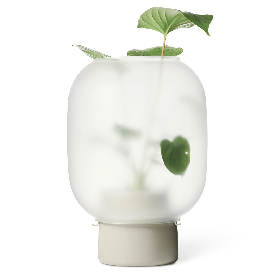 Květináč se skládá ze dvou částí: keramické základny, do níž umístíte rostlinku v květináči (ideálně do průměru 12 cm), a matného skleněného krytu, který lze umístit ve dvou různých výškách. Tento variabilní design nabízí možnost hrát si s proporcemi a vizuálně zvýraznit rostlinu. Matná povrchová úprava dodává květináči exkluzivitu a sofistikovaný vzhled, který zaujme na první pohled.