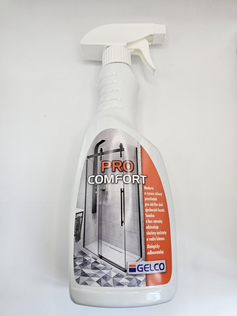 PRO COMFORT ze skleněných výplní rychle a bez námahy odstraňuje všechny nečistoty, skvrny od mýdla a vodní kámen.Je vysoce účinný a odbourává takzvanou korozi skla, při které sklo šedne a matovatí.Díky rozprašovači je aplikace velmi snadná a rychlá. Návod k použití:Pomocí rozprašovače naneste přípravek na znečištěnou plochu. Vlhkým hadříkem rozetřete a opláchněte čistou vodou. U silně znečištěnýchploch nechte před spláchnutím několik minut působit. Pro kompletní péči naneste na takto vyčištěná skla ochrannou vrstvu TOP COMFORT. Množství (500 ml)