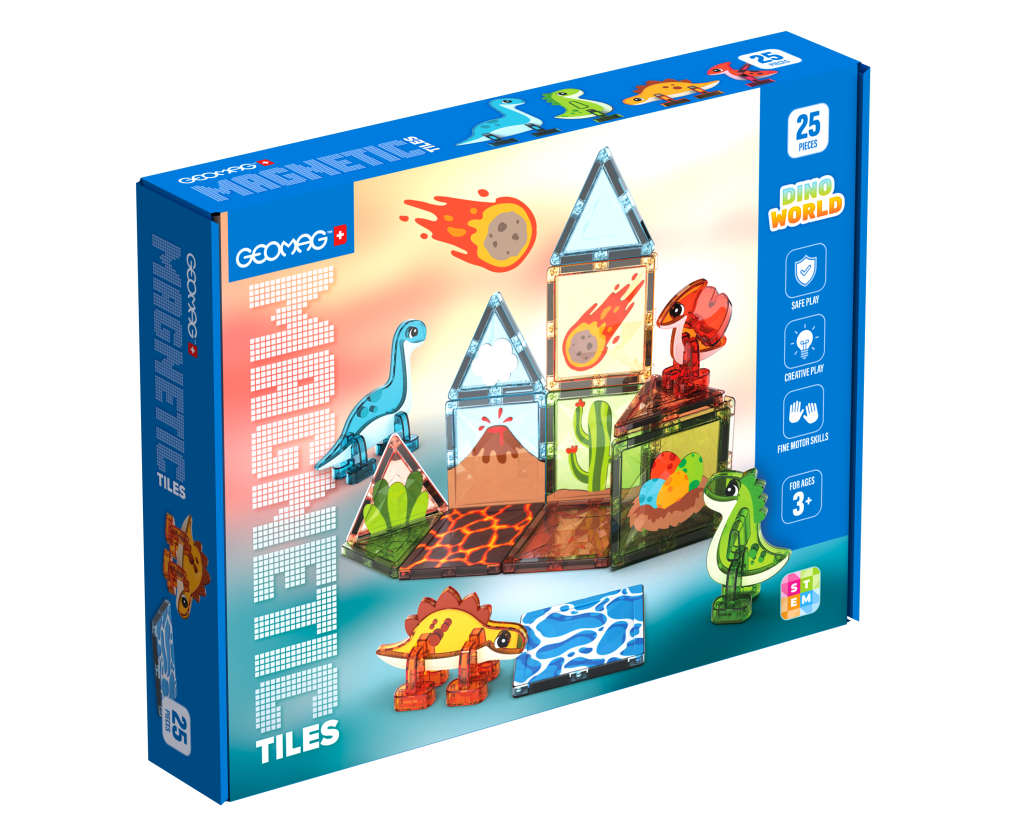 Geomag Magnetic Tiles Dino obsahuje magnety na všech stranách jednotlivých geometrických tvarů. Lze tak snadno vytvářet jakékoliv 2D obrazce nebo 3D struktury. Kromě toho jsou součástí i 4 figurky dinosaurů. Stavebnice rozvíjí manuální zručnost, kreativitu a fantazii, učí barvy, geometrické tvary, ale hlavně si s ní děti užijí spoustu zábavy. Obsahuje celkem 25 dílků. Vhodné od 3 let.