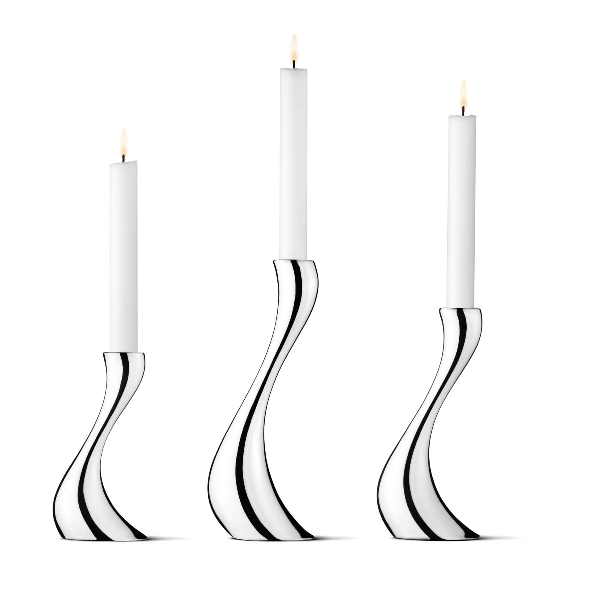 Set tří svícnů – malý, střední a velký – působí jako organická skupina, která přináší do interiéru pocit dynamiky a lehkosti.