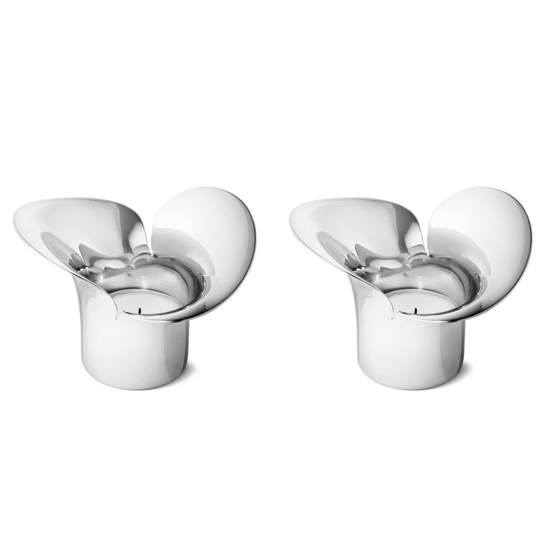 Svícínky byly navrženy pro značku Georg Jensen dánskou designérkou Helle Damkjær, která každý produkt pečlivě modeluje z hlíny, aby výsledný tvar byl co nejautentičtější, aby působil jemně a harmonicky. Přestože jsou svícny vyrobeny z nerezové oceli, díky preciznímu ručnímu zpracování působí měkce a přívětivě. výška 7 cm / průměr 4,4 cm Ručně leštěná nerezová ocel.