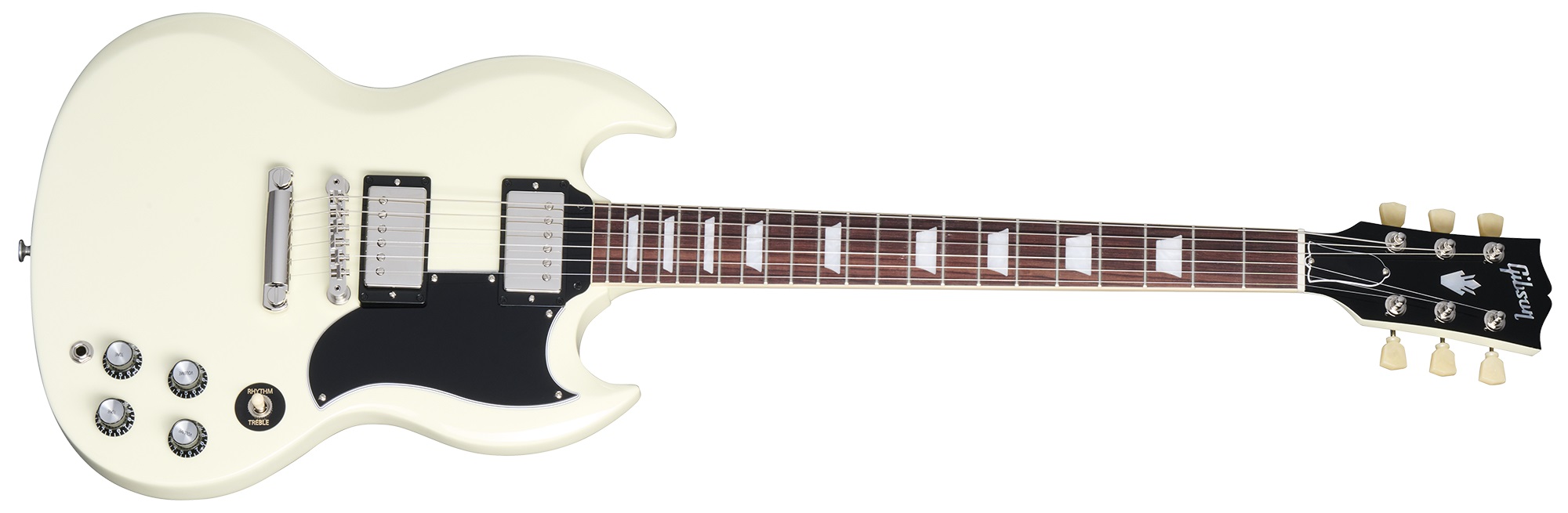 Elektrická kytara Elektrická kytara Gibson SG patří právem mezi nesmrtelné ikony rockové hudby. S jejím zvukem jsou spojena jména kytarových legend jako Carlos Santana, Pete Townshend a dalších velikánů rockové muziky. Mahagonové tělo kytary SG Standard '61 Stop Bar Classic White zdobí barevná úprava Classic White a tenká povrchová úprava v podobě laku z nitrocelulózy. K mahagonovému krku s profilem “SlimTaper” je přilepen palisandrový hmatník osazený dvaadvaceti pražci velikosti Medium Jumbo. Orientaci na