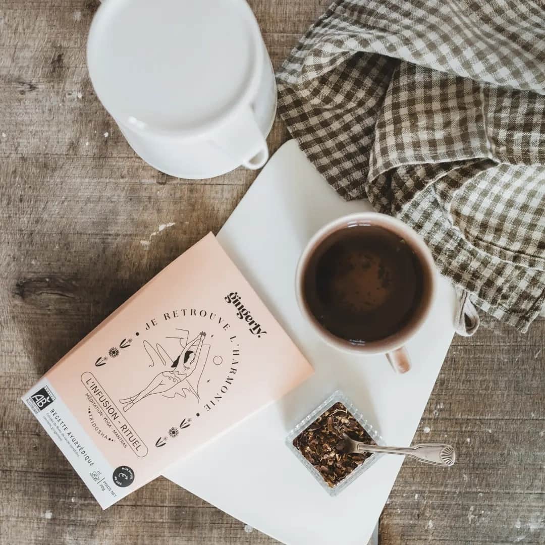 GINGERLY BIO sypaný čaj – Nacházím harmonii 70 g, růžová barva, papír, textil. Prožijte svůj relaxační rituál ještě intenzivněji, s šálkem prémiového čaje Gingerly ve 100% BIO kvalitě. Čaje, který se opírá o principy ajurvédy, indické medicíny předků.