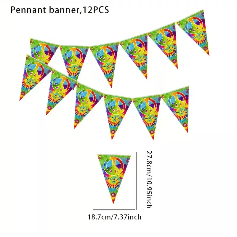 Ozdobená květinami, duhovými vzory a symboly PEACE navodí dokonalou náladu plnou lásky, svobody a hudby. Ideální na festivaly, retro oslavy, letní garden party nebo karnevaly.