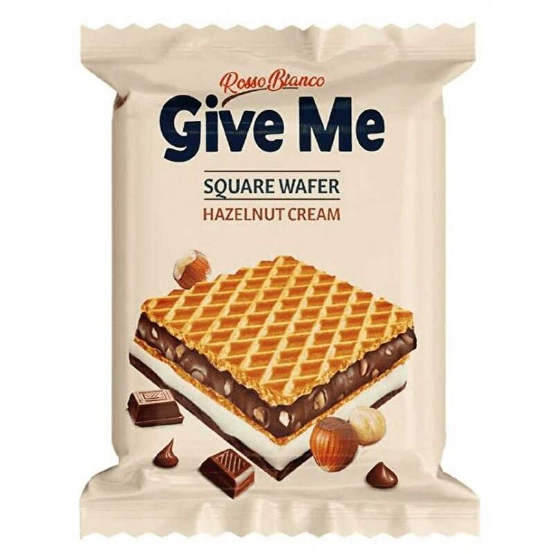 Give Me Hazelnut Cream 30g Příjemná malá svačinka. Křupavá oplatka s mléčným a oříškovým krémem s kousky lískových oříšků a kakaovou polevou. Složení: cukr, rostlinný olej (palmový), demineralizovaná sušená syrovátka, pšeničná mouka, sušené odstředěné mléko, maltodextrin, kakaový prášek, sušené plnotučné mléko, lískové oříšky, karobový prášek, emulgátor (slunečnicový lecitin), kukuřičný škrob, máslo ghí, sůl, kypřící látky (E500, E 503), aromata (lískové ořechy, mléko, vanilin). Může obsahovat sójový produkt, arašídy, mandle a pistácie. Alergeny vyznačeny tučným písmem. Průměrné výživové hodnoty 100g: Energie 517kcal/ 2166kJ Tuky/z toho nasycené mastné kyseliny 30,2g/ 15,3g Sacharidy/ z toho cukry 58,9g/ 35,9g Vláknina Bílkoviny 6,9g Sůl 0,3g Vyrobeno: Turecko