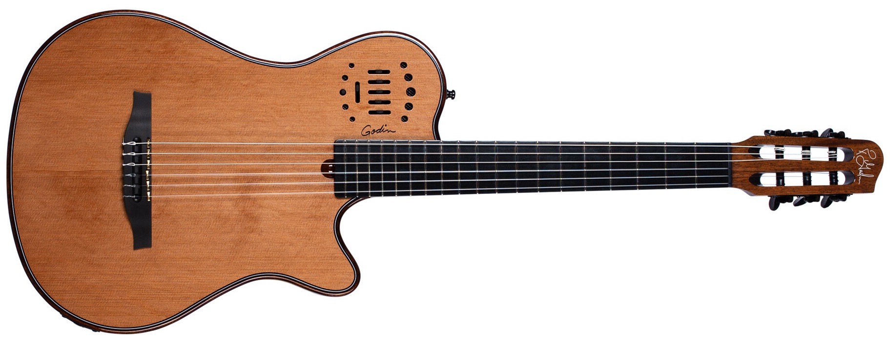 Klasická elektroakustická kytara Série Multiac kanadské značky Godin nabízí atypické modely hybridních elektroakustických nástrojů s nevšedními zvukovými možnostmi a zajímavým designem. Základ zvuku klasické elektroakustické kytary Multiac Grand Concert Mahogany Deluxe tvoří lehké komorované (two-chambered) mahagonové tělo a masivní cedrový top. Přirozenou kresbu mahagonu a cedru podtrhuje lak rozlěštěný do