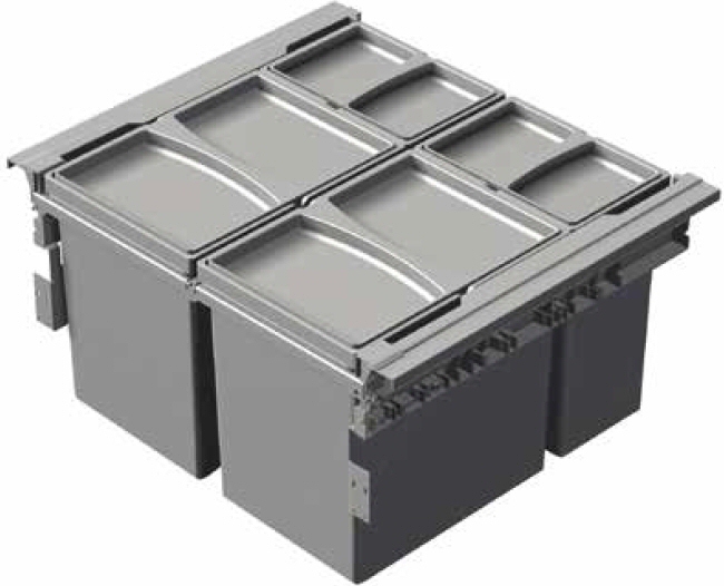 vhodné pro skříňky o vnější šířce korpusu 600mmVelkokapacitní sortery jsou dnes požadavkem běžných zákazníků, kteří chtějí současně maximálně využít vnitřní prostor skříně. Množství domácího odpadu je v dnešní době stále větší a tudíž se zvyšují i nároky na velikosti sorterů. Tento požadavek splňuje nová řada sorterů Concept 560, s robustními koši s velkou kapacitou. - možnost použít samostatný horní kryt pro koše (po otevření budou koše připraveny pro okamžité použití)- kovový rám pro zavěšení košů včetně příček (boční díly plast)- pro tloušťku materiálu korpusu 18-19 mm Hlavní výhody:- snadná instalace systému položením na výsuvy (výsuvy nejsou součástí balení)- možnost kombinovat s výsuvy Blum (Tandembox, Antaro, Intivo, Legrabox), FGV (Ten), Hettich (ArciTech), Strongbox a dalšíPozor!!! Výsuvy nejsou součástí- pro hloubku výsuvu 500mm- celková výška 298mm- objem košů 2x 17l + 2x 8l- doporučeno kombinovat s výsuvy Blum Tandembox Antaro viz související produkty