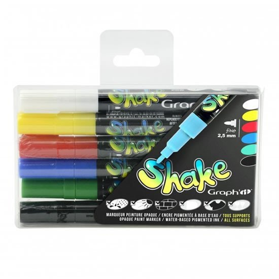 Sada popisovačů (6ks) s pigmentovaným inkoustem na vodní bázi, vhodným na většinu povrchů. Velikost hrotu 2,5mm. Je permanentní na porézních materiálech (látka, papír, dřevo,…) a je smazatelný z hladkého povrchu (sklo, plast). Rychleschnoucí, odolný vůči