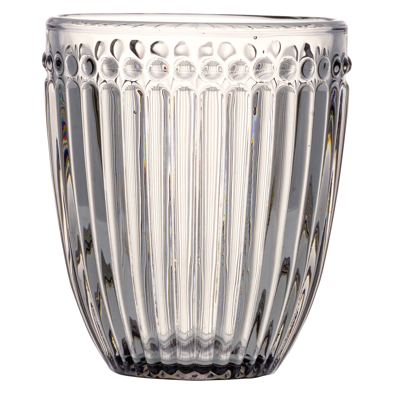 GREEN GATE Sklenice Alice Grey 250 ml, šedá barva, sklo. Vychutnejte si váš oblíbený nápoj ještě o doušek víc. Ze sklenice na vodu z dílny dánské značky Green Gate chutná zkrátka lépe. Jste-li jejími příznivci, pak byste si neměli nechat utéct zdobenou skleničku v univerzálním šedivém odstínu s výraznými vroubky zakončenými malými puntíky.