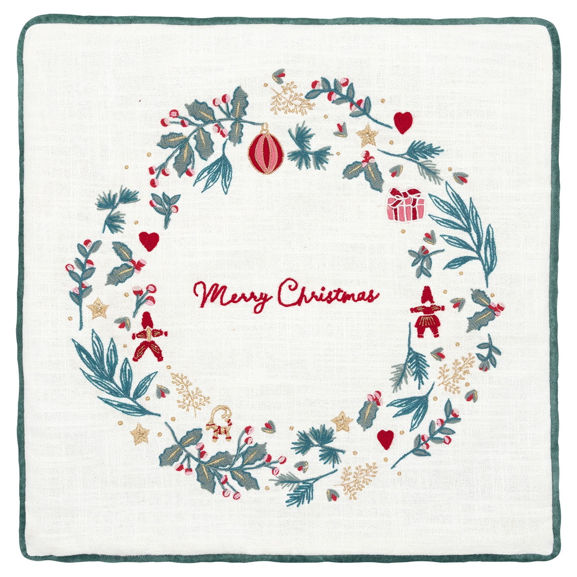 GREEN GATE Vyšívaný povlak na polštář Didina White 40 × 40 cm, zelená barva, textil. Povlak na polštář z kolekce Didina White od značky Green Gate přináší do vašeho domova kouzlo vánočních tradic. Jemná výšivka věnce s klasickými motivy jako cesmína, šišky, skřítci a zlaté hvězdy spolu s nápisem Merry Christmas vytváří slavnostní a útulnou atmosféru.