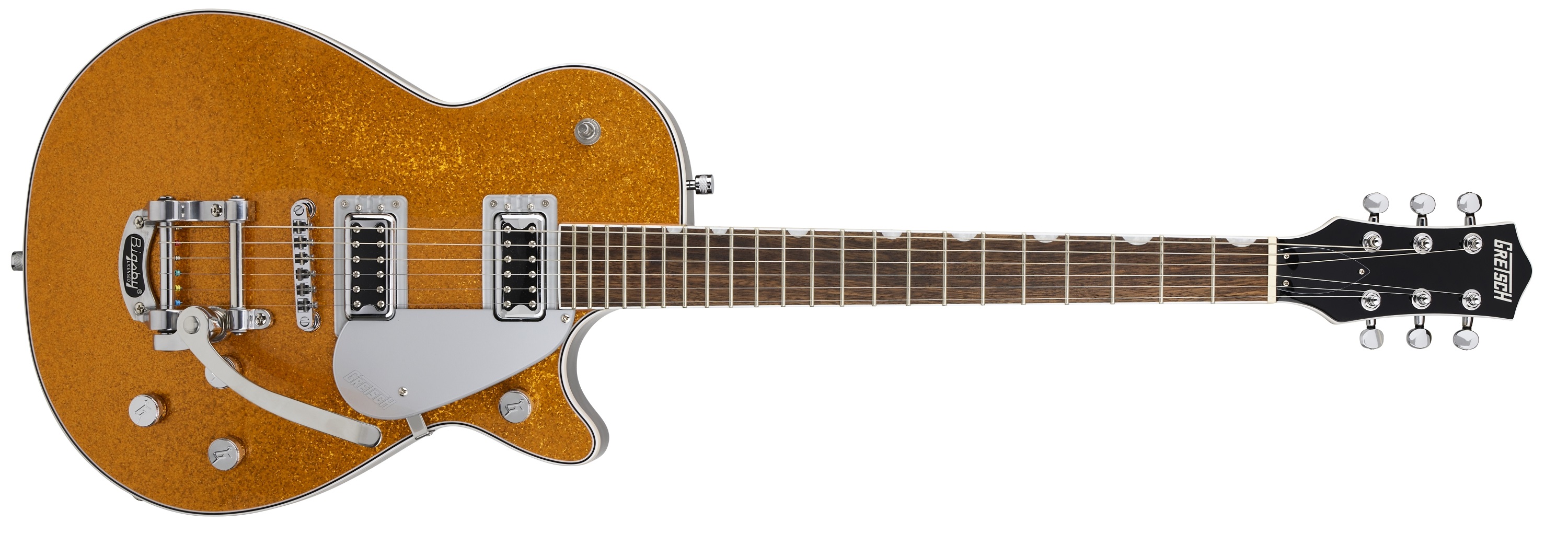 Elektrická kytara Elektrické kytary Gretsch Duo Jet v single-cut designu utváří od roku 1953 až do dnešních dní zvukový profil řady slavných kytaristů a hudebních těles. Model G5230T Electromatic Jet FT LRL GSP ze základní řady Electromatic nabízí design, zvuk a feel kytar Gretsch Jet za cenu dostupnou širokému okruhu zájemců. Komorované mahagonové tělo kytary zdobí javorový top a barevná úprava Gold Sparkle. K mahagonovému krku s užším Thin U profilem je přilepen hmatník z fíkovníku osazený dvaadvaceti pra