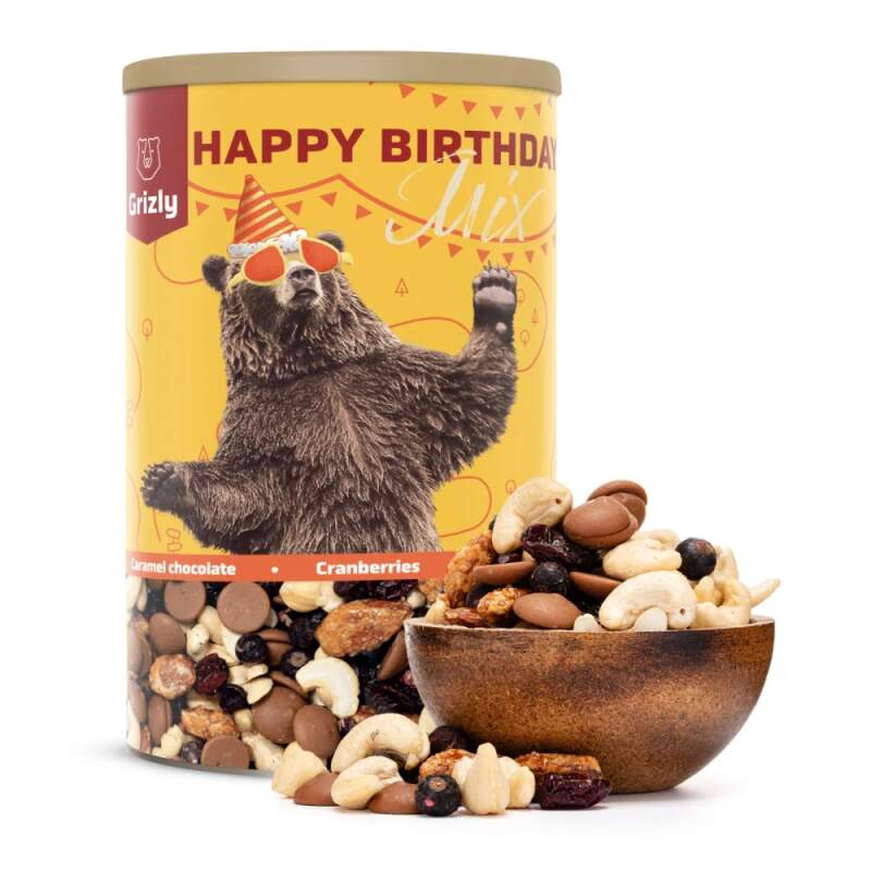 Narozeninový mix Obsahuje ty nejlepší dobroty - kešu, lískové oříšky, sladko-slané mandle, karamelovou čokoládu, sušené brusinky a lyofilizovaný černý rybíz. V mixu ochutnáte báječně křupavé kešu a lískové oříšky, sladké mandle se špetkou soli, sušené brusinky a voňavý lyofilizovaný černý rybíz, vše doplněné výbornou karamelovou čokoládou. Směs je zabalena v praktickém a designovém tubusu, je tedy ideální jako originální dárek pro toho, koho máte rádi a skvěle i doplní narozeninové pohoštění. Do našich směsí používáme vysoce kvalitní suroviny, které zároveň prodáváme i samostatně. Můžete se tedy spolehnout na čerstvost a bezchybnou chuť každého jednotlivého kousku. Složení: Jádra kešu ořechů 25 %, mandle s medem a mořskou solí 20 % (mandle 76 %, cukr 18,5 %, med 3,5 %, mořská sůl 2 %), jádra lískových ořechů loupaná 20 %, karamelová čokoláda 15% (cukr, kakaové máslo, sušené plnotučné mléko, kakaová hmota, sušené odstředěné mléko, karamelizovaný cukr 1,5 %, emulgátor: sójový lecitin, aroma, paprikový extrakt , přírodní vanilkové aroma), klikva celá 15 % (klikva [55-65%], cukr [35-45%], slunečnicový olej [0,3-1%]), rybíz černý lyofilizovaný 5 %. Může obsahovat stopy arašídů, jiných skořápkových plodů, sezamu a siřičitanů. Země původu: Česká republika Skladování: Skladujte na chladném a suchém místě, mimo přímé sluneční světlo. Balení: Tubus Výživové údaje na 100 g: Energetická hodnota: 2291 kJ / 548 kcal Tuky: 38,2 g z toho nasycené mastné kyseliny: 7,2 g Sacharidy: 39,8 g z toho cukry: 26,4 g Vláknina: 6,9 g Bílkoviny: 11,5 g Sůl: 0,43 g