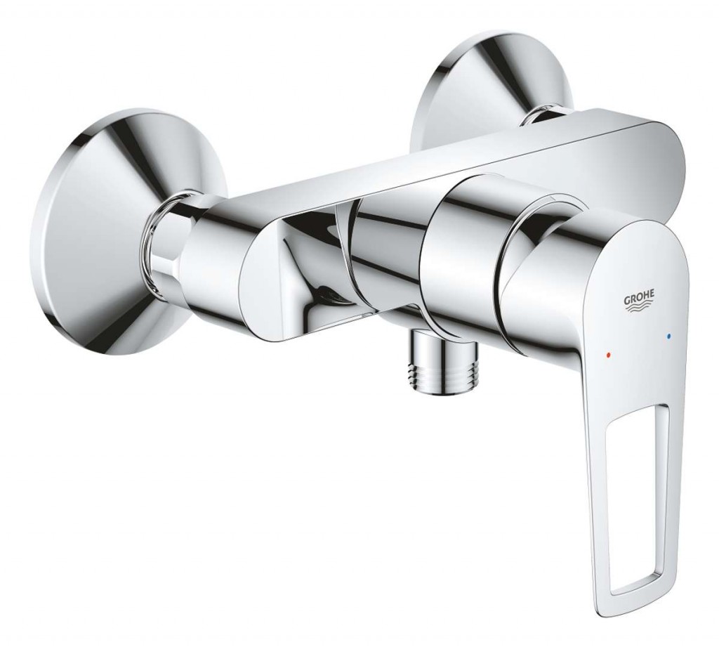 Páková sprchová baterie, DN 15 barva: chrom povrchová úprava GROHE Long-Life nástěnná montáž GROHE Long-Life 35 mm keramická kartuše s omezovačem teploty nastavitelný omezovač průtoku výstup sprchy dole DN 15 s integrovanou zpětnou klapkou ochrana proti zpětnému toku vody S-přípojky, kovová nástěnná rozeta rozteč připojení: 150±15 mm