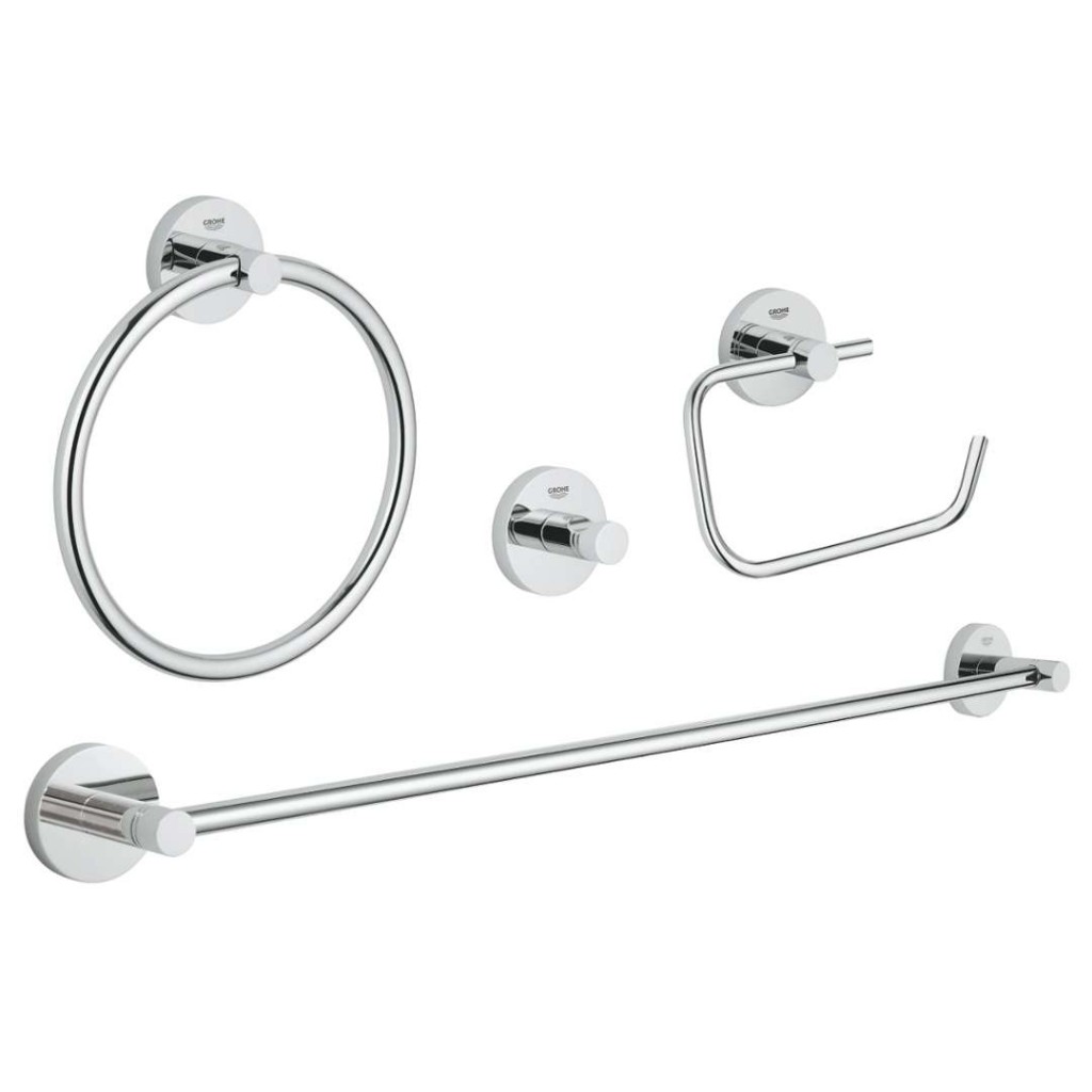 Sada doplňků GROHE Essentials 4 v 1 do koupelny obsahuje držák na osušky materiál: kov 654 mm (funkční délka 600 mm) skryté upevnění GROHE StarLight chromový povrch kruhový držák na ručníky materiál: kov skryté upevnění GROHE StarLight chromový povrch háček na koupací plášť materiál: kov skryté upevnění GROHE StarLight chromový povrch Držák toaletního papíru materiál: kov bez krytu skryté upevnění GROHE StarLight chromový povrch
