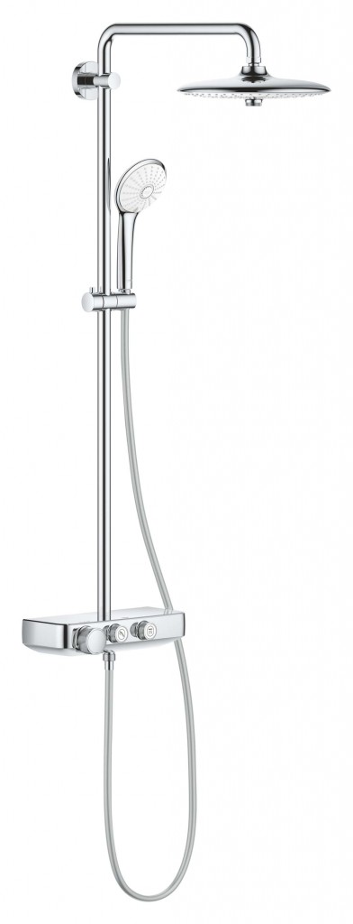 Sprchový systém 260 Mono obsahuje nástěnný termostat SmartControl umožňuje změnu mezi horní a ruční sprchou GROHE StarLight chromový povrch GROHE ProGrip s rýhovanou strukturou GROHE CoolTouch ochrana proti opaření GROHE TurboStat kompaktní kartuše s termoprvkem GROHE EcoJoy technologie pro nízkou spotřebu vody a perfektní průtok GROHE SafeStop při 38°C GROHE SafeStop Plus volitelný omezovač teploty při 43°C SmartControl tlačítko pro regulaci objemu vhodné pro průtokové ohřívače vody s výkonem od 18 kW/H minimální průtok 7 l/min doporučený minimální tlak vody 1,0 baru hlavovou sprchu Euphoria 260 SmartControl se sprchovým ramenem průměr hlavice: 260 mm 3 sprchové proudy: Rain, SmartRain, Jet kulový kloub s úhlem otočení +/-15 ° přípojný závit DN 15 GROHE DreamSpray perfektní vodní paprsky GROHE StarLight chromový povrch GROHE SpeedClean odstranění vodního kamene přetřením vnitřní WaterGuide pro delší životnost vhodné pro průtokové ohřívače vody minimální tlak 1,0 bar horizontální sprchové rameno 450 mm ruční sprchu Euphoria 110 se sprchovou hadicí průměr hlavice: 110 mm sprchový proud Rain, Massage, SmartRain GROHE DreamSpray perfektní vodní paprsky GROHE SprayDimmer plynulé nastavení průtoku vody GROHE StarLight chromový povrch, bílá spodní část sprchy GROHE SpeedClean odstranění vodního kamene přetřením vnitřní WaterGuide pro delší životnost univerzální upevňovací systém, vhodný ke všem standardním sprchovým hadicím sprchová hadice Silverflex 1750 mm Technický list Rozkres dílů - 1 Rozkres dílů - 2 Rozkres dílů - 3