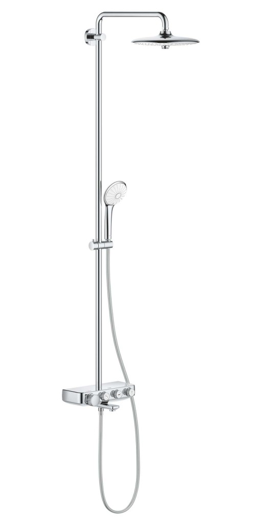 Sprchový systém 260 Mono obsahuje nástěnný vanový termostat SmartControl umožňuje změnu mezi horní a ruční sprchou GROHE StarLight chromový povrch GROHE ProGrip s rýhovanou strukturou GROHE CoolTouch ochrana proti opaření GROHE TurboStat kompaktní kartuše s termoprvkem GROHE EcoJoy technologie pro nízkou spotřebu vody a perfektní průtok GROHE SafeStop při 38°C GROHE SafeStop Plus volitelný omezovač teploty při 43°C SmartControl tlačítko pro regulaci objemu vhodné pro průtokové ohřívače vody s výkonem od 18 kW/H integrovaná přihrádka GROHE EasyReach hlavovou sprchu Euphoria 260 SmartControl se sprchovým ramenem průměr hlavice: 260 mm 3 sprchové proudy: Rain, SmartRain, Jet kulový kloub s úhlem otočení +/-15 ° přípojný závit DN 15 GROHE DreamSpray perfektní vodní paprsky GROHE StarLight chromový povrch GROHE SpeedClean odstranění vodního kamene přetřením vnitřní WaterGuide pro delší životnost vhodné pro průtokové ohřívače vody minimální tlak 1,0 bar horizontální sprchové rameno 450 mm ruční sprchu Euphoria 110 se sprchovou hadicí průměr hlavice: 110 mm s bílou spodní částí sprchy sprchový proud Rain, Massage, SmartRain GROHE DreamSpray perfektní vodní paprsky GROHE SprayDimmer plynulé nastavení průtoku vody GROHE StarLight chromový povrch, bílá spodní část sprchy GROHE SpeedClean odstranění vodního kamene přetřením vnitřní WaterGuide pro delší životnost výškově nastavitelná s kluzákem univerzální upevňovací systém, vhodný ke všem standardním sprchovým hadicím sprchová hadice Silverflex 1750 mm