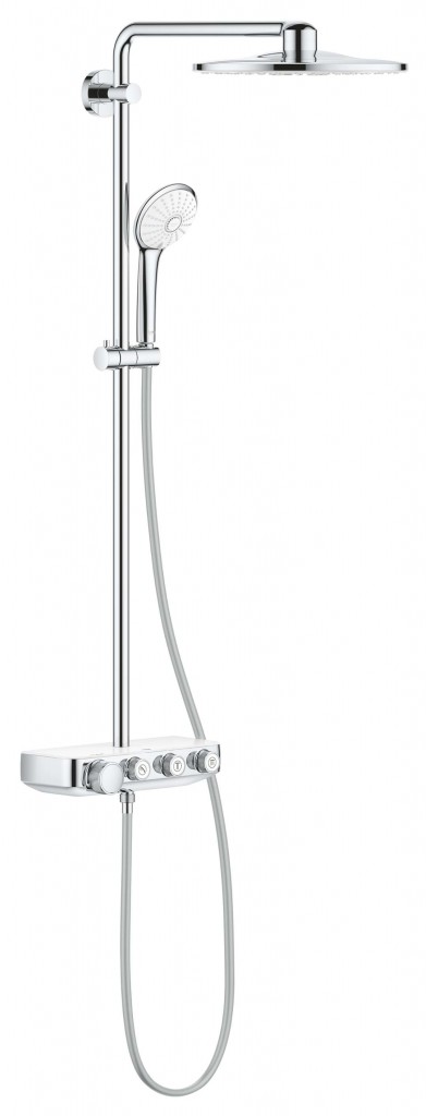 Sprchová souprava obsahuje nástěnný termostat SmartControl horní část termostatu v barvě měsíční bílá GROHE TurboStat kompaktní kartuše s voskovaným termočlánkem GROHE SafeStop bezpečnostní tlačítko na 38°C GROHE SafeStop Plus volitelný omezovač teploty na úrovni 43°C GROHE CoolTouch ochrana proti opaření GROHE SmartControl tlačítko pro regulaci objemu GROHE EcoJoy technologie pro nízkou spotřebu vody a perfektní průtok vhodné pro průtokové ohřívače od 18 kW minimální průtok 7 l/min umožňuje změnu mezi ruční a hlavovou sprchou hlavovou sprchu Rainshower SmartActive 310 se sprchovým ramenem průměr sprchové hlavice 310 mm spodní část sprchové hlavice v barvě měsíční bílá dva sprchové proudy: PureRain, ActiveRain sprchové proudy lze přepínat nebo spustit současně GROHE DreamSpray perfektní vodní paprsky GROHE StarLight chromový povrch GROHE SpeedClean odstranění vodního kamene přetřením horizontální sprchové rameno 450 mm vnitřní WaterGuide pro delší životnost    ruční sprchu Euphoria 110 Massage průměr sprchové hlavice 110 mm sprchový proud: Rain, Massage, SmartRain GROHE DreamSpray perfektní vodní paprsky GROHE SprayDimmer - plynulé nastavení průtoku vody GROHE StarLight chromový povrch, bílá spodní část sprchy GROHE SpeedClean odstranění vodního kamene přetřením vnitřní WaterGuide pro delší životnost univerzální upevňovací systém, vhodný ke všem standardním sprchovým hadicím vhodné pro průtokové ohřívače vody minimální tlak 1,0 bar sprchovou hadici Silverflex délka: 1750 mm DN 15 x DN 15 sprchová hadice s hladkým povrchem, lehce udržovatelná, flexibilní Twistfree otočný kónus s flexibilním a oboustranným závitem proti překroucení GROHE StarLight chromový povrch