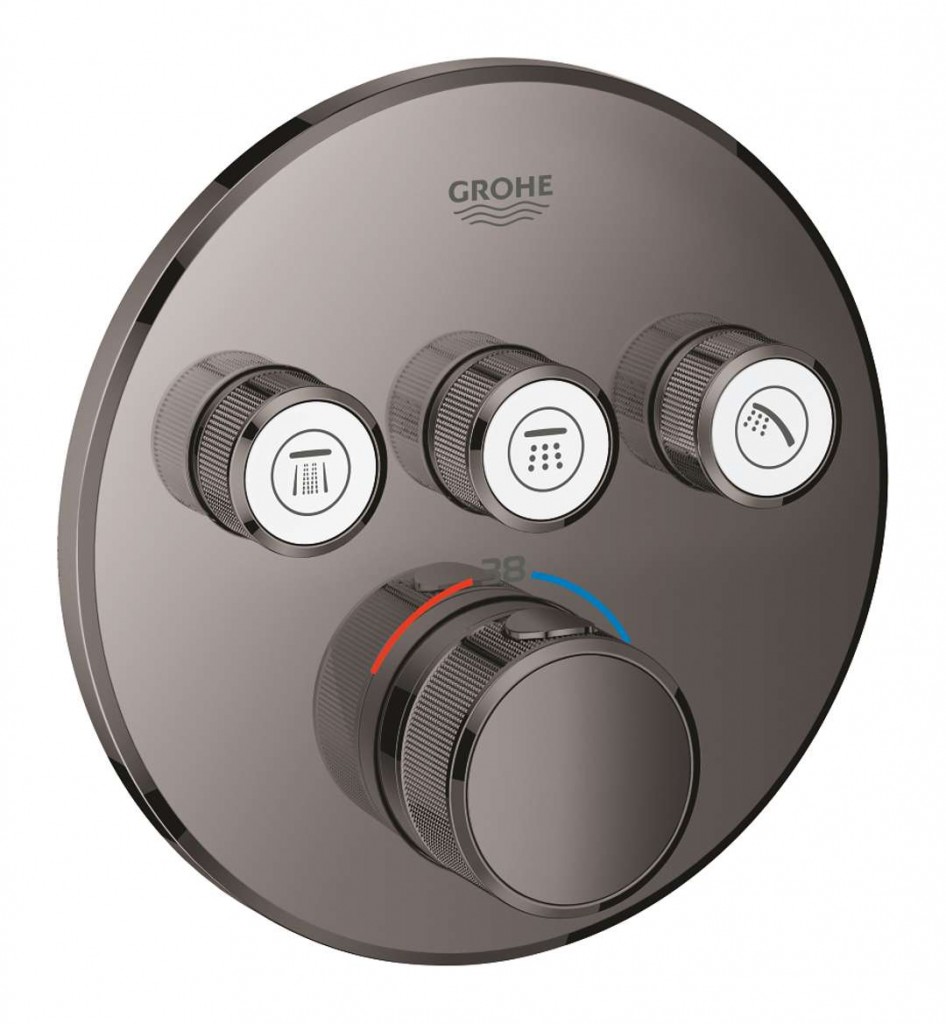 Sprchová termostatická baterie pod omítku bez tělesa barevné provedení: Hard Graphite 3 ventily GROHE QuickFix krytá kovová rozeta s těsněním, skryté připevnění, nastavitelná ±6° GROHE PVD povrch GROHE SmartControl tlačítko ON-OFF, ovládání proudu od EcoJoy do plného proudu Full Flow vyměnitelné symboly kompaktní kartuše s termoprvkem GROHE SafeStop bezpečnostní zarážka při 38°C GROHE SafeStop Plus volitelný omezovač teploty při 43°C integrované zpětné klapky a sítko na nečistoty výstupy mohou být spuštěny současně průtok: výstup A = 23 l/min, výstup B = 27 l/min, výstup C = 23 l/min, výstup A + B = 33 l/min výstup A + B + C = 36 l/min Instalace na montážní těleso GROHE Rapido SmartBox, není součástí dodávky.