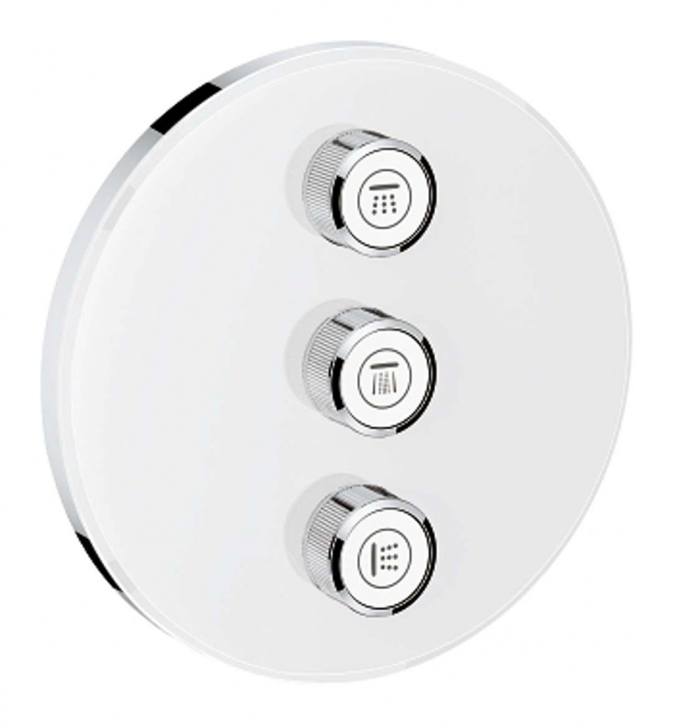 Podomítkový ventil se 3 výstupy instalace na montážní těleso, je třeba objednat zvlášť GROHE Rapido SmartBox 35 600 000/35 601 000 kovová rozeta s GROHE QuickFix (krytá rozeta s těsněním, skryté připevnění), nastavitelná ± 6° GROHE StarLight povrch SmartControl tlačítko ON-OFF, ovládání proudu od EcoJoy do plného proudu Full Flow vyměnitelné symboly výstupy mohou být spuštěny současně krytka v provedení měsíční bílá Průtok výstup D = 28 l/min výstup E = 28 l/min výstup A = 28 l/min výstup D+E+A = 65 l/min
