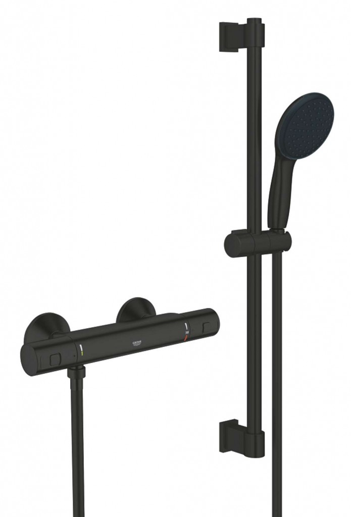Sprchový set s termostatem obsahuje termostatickou sprchovou baterii barva: matte black - matná černá GROHE Long-Life povrch kompaktní kartuše GROHE TurboStat s voskovaným termočlánkem tlačítková pojistka GROHE SafeStop na 38 °C GROHE Water Saving – méně vody, dokonalý průtok ovládání průtoku s úsporným tlačítkem a individuálně nastavitelnou úspornou zarážkou rozteč připojení: 150 mm integrovaný uzávěr smíšené vody keramický vršek DN 15, 180° integrované zpětné klapky zachytávač nečistot S-přípojky, kovová rozeta ruční sprchu Vitalio Start 110 průměr: 110 mm 1 sprchový proud - Rain odvápňovací systém SpeedClean GROHE DreamSpray – perfektní proud vody sprchovou tyč a hadici rozteč uchycení tyče: 470 - 620 mm s posuvným držákem ruční sprchy montáž: vrtáním nebo lepením lepidlo není součástí balení - pro nalepení tyče doporučujeme zakoupit 2 kusy lepidla sprchová hadice, délka 1750 mm