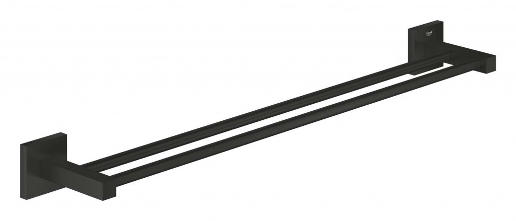 Dvouramenný držák na ručníky barva: matte black - matná černá GROHE Long-Life povrch materiál: kov celková délka: 654 mm rozteč uchycení 600 mm čtvercové rozety skryté upevnění instalace vrtáním (obsahuje šrouby a hmoždinky)