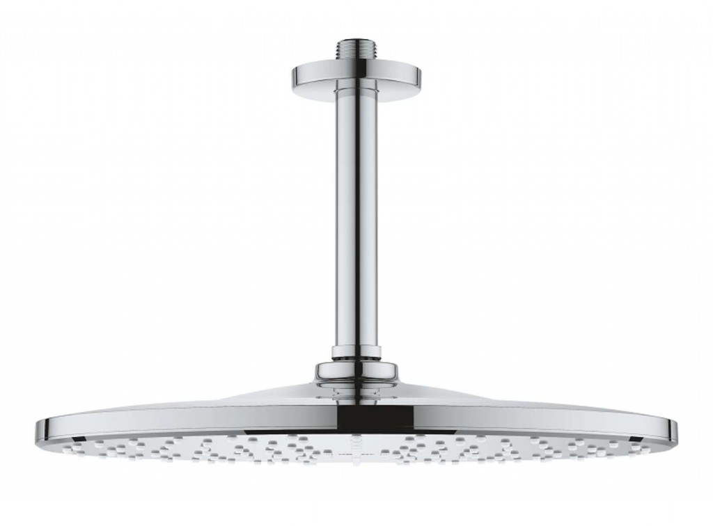 Horní sprcha se stropním sprchovým ramenem průměr sprchové hlavice 310 mm chromová spodní část sprchy GROHE PureRain sprchový proud GROHE DreamSpray perfektní vodní paprsky GROHE StarLight chromový povrch GROHE SpeedClean - odstranění vodního kamene přetřením vnitřní WaterGuide pro delší životnost vhodné pro průtokové ohřívače vody doporučený minimální tlak vody 1,0 bar stropní sprchové rameno Rainshower, délka 142 mm
