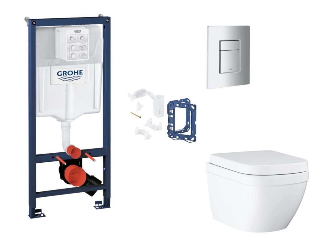 Kompletní WC set obsahuje podomítkový modul Rapid SL závěsné WC Euro Ceramic, s technologií Rimless a Triple Vortex WC sedátko, s technologií SoftClose splachovací tlačítko Skate Cosmopolitan, matný chrom Fresh přestavbový set pro umístění tablet Instalační prvek Rapid SL pro závěsné WC splachovací nádrž GD 2 stavební výška 1,13 m pro předstěnovou montáž nebo montáž do lehké příčky ocelový rám, práškové lakování, samonosný pro obložení sádrokartonem, kompletně předmontováno pevné objektové přípojky pro jednotlivou montáž nebo montáž na kolejnici rychlé nastavení, uzamykatelné upevňovací materiál certifikováno TÜV 2 úchyty pro WC upevnění keramiky - rozteč šroubů 180/230 mm WC keramika s plochou menší než 205 mm vyžaduje dodatečné příslušenství 38 779 000 odpadní koleno Ø 90 mm hloubkově nastavitelné redukce Ø 90/110 mm přívodní a odpadní souprava splachovací nádrž 6 - 9 l (nastaveno z výroby na 6 - 3 l) pneumatický odtokový ventil nabízí 3 režimy chodu:2-činné splachování, start/stop a nebo nepřerušitelné (pouze start) přívod vody zleva / zprava nebo zezadu skupina armatur I - nízká hlučnost izolováno od kondenzující vody přípojka vody DN 15 s integrovaným rohovým ventilem a šroubovým spojem bez použití nářadí pro instalaci není třeba nářadí kontrolní hřídele včetně ochrany během fáze výstavby pro vertikální nebo horizontální použití splachovacích tlačítek včetně nástěnných držáků 38 558 00M pro montáž na stěnu Závěsný klozet Euro Ceramic materiál: glazovaná hladká keramika barva: alpská bílá pro podomítkové nádrže zadní odpad GROHE Triple Vortex technologie trojitého splachování hluboké splachování Rimless technologie objem spláchnutí 3/5 l spodní skrytá instalace WC sedátko s funkcí softclose barva: alpská bílá materiál: duroplast s technologií pomalého sklápění SoftClose s poklopem odnímatelné, snadné upevnění shora panty z nerezové oceli včetně montážní sady Ovládací tlačítko Skate Cosmopolitan barva: matný chrom rozměr: 156 x 197 x 12 mm materiál: ABS povrchová úprava GROHE Long-Life pro 2-činné splachování nebo funkci start/stop pro pneumatický odtokový ventil AV1 GROHE Water Saving – méně vody, dokonalý průtok GROHE Fresh přestavbový set pro splachovací nádrž GROHE GD 2 s pneumatickým výtlačným ventilem a standardním revizním otvorem není vhodné pro tlačítka Skate Cosmopolitan se dřevěným nebo skleněných povrchem rámeček s funkcí otevírání s nádobkou pro umístění tablet pouze pro bezchlórové tablety pro všechna splachovací tlačítka GROHE s rozměry 156 x 197 mm