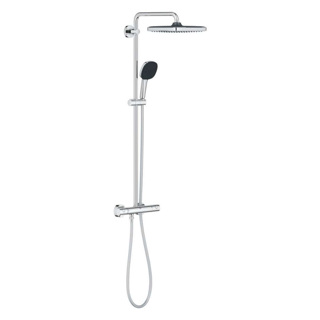 Sprchový set Vitalio Comfort obsahuje nástěnný sprchový termostat barva: chrom povrchová úprava GROHE Long-Life GROHE TurboStat - zajišťuje stálý přísun vody o ideální teplotě GROHE Water Saving - výrazně snižuje spotřebu vody a energie snadné ovládání díky ergonomickým rukojetím GROHE MetalGrip GROHE SafeStop - ochrana proti opaření, je nastaveno na 38 °C volitelný systém GROHE SafeStop Plus - umožňuje přidat další limit 43 °C pro vyšší úroveň bezpečnosti funkce AquaDimmer - přepínání mezi hlavovou a ruční sprchou a regulace objemu vody GROHE QuickSpanner - nástroj pro snadnou instalaci rozteč připojení: 150±15 mm hlavovou sprchu Vitalio Comfort 250 rozměr: 250 x 250 mm 1 sprchový proud - Rain černý zadní kryt povrchová úprava GROHE Long-Life GROHE DreamSpray - zajišťuje rovnoměrný průtok systém SpeedClean proti vodnímu kameni ruční sprchu Vitalio Comfort 110 rozměr: 110 x 110 mm 2 druhy proudu - Rain, Jet GROHE SmartSwitch - snadný výběr proudu povrchová úprava GROHE Long-Life GROHE DreamSpray - zajišťuje rovnoměrný průtok odvápňovací systém SpeedClean silikonový kroužek ShockProof chrání ruční sprchu před poškozením při pádu sprchovou hadici VitalioFlex Comfort délka 1750 mm s funkcí TwistStop proti překroucení připojení G1/2 sprchový systém rozteč uchycení 1010 (+40, -100) mm celková výška: 1120 mm s výškově nastavitelným držákem ruční sprchy