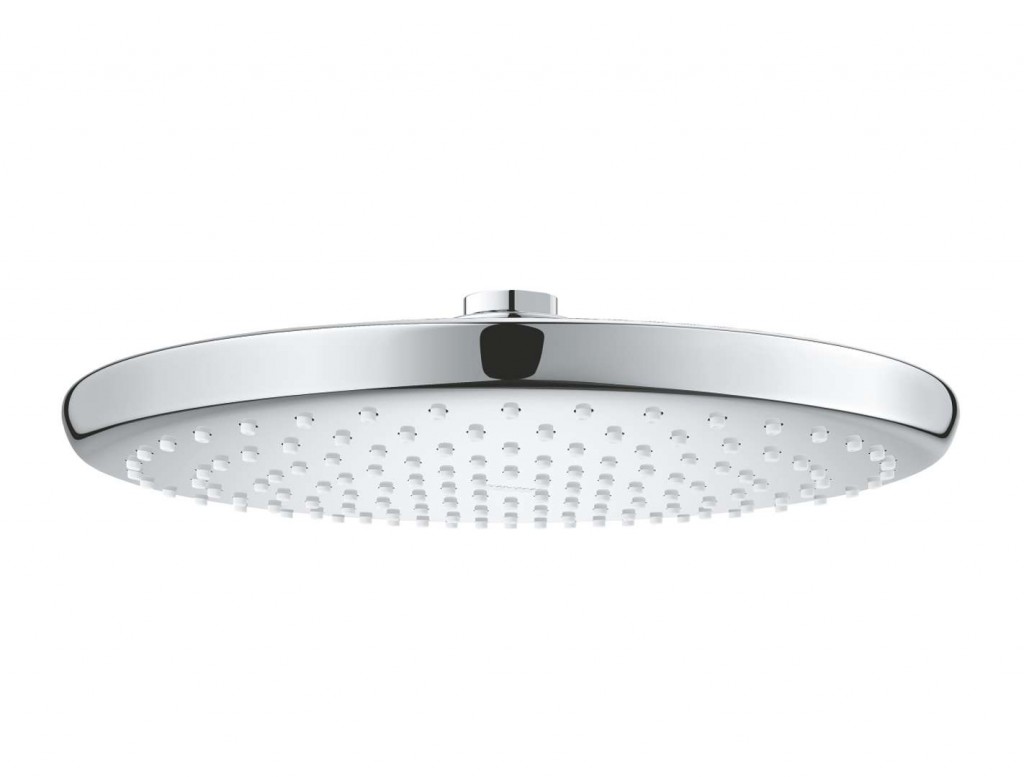 Horní sprcha s jedním druhem sprchového proudu sprchový proud Rain průměr sprchové hlavice 250 mm kloub s úhlem otočení ± 10° přípojný závit DN 15 GROHE EcoJoy 9,5 l/min omezovač průtoku GROHE DreamSpray perfektní vodní paprsky GROHE StarLight chromový povrch GROHE SpeedClean odstranění vodního kamene přetřením vnitřní WaterGuide pro delší životnost vhodné pro průtokové ohřívače vody doporučený minimální tlak vody 1,0 bar