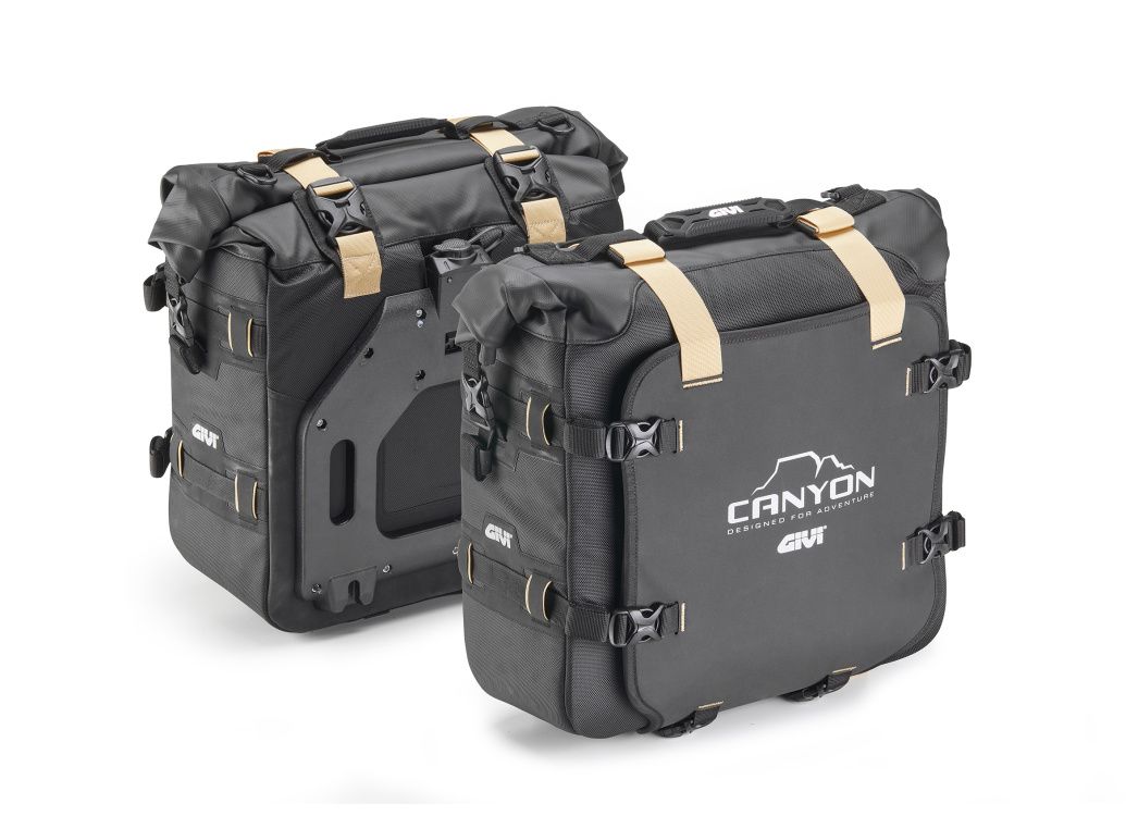 Voděodolné boční brašny pro enduro a off-road, objem 2x25 litrů (dodává se v páru). Rozměry 400x400x170 mm. Zadní strana brašen je vybavena plastovou základnou, kterou lze připnout k trubkovým nosičům GIVI řady MONOKEY - PL..., PLR..., PLO...MK, PLOR...MK - tím pádem je brašna uzamykatelná k nosiči a je něčím mezi klasickou brašnou a kufrem. Nelze uchytit na nosiče hliníkových kufrů PLO...CAM. Vodotěsné rolovací uzávěry, vodotěsný vnitřní vak (IP 65) pro náročné podmínky. Řada výrobků CANYON. Modulární systém upevnění, lze kombinovat např. s GRT730. NOVINKA 2025.