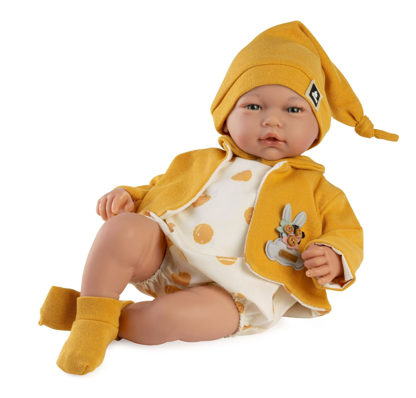Zvuková panenka miminko s měkkým látkovým tělem, která po zatlačení na hrudník začne vydávat reálný zvuk smějícího se dítěte. Ruce a nohy jsou k tělu přichyceny kloubem. Miminko je polohovací a může i sedět. Velikost 46 cm. Ručně vyrobeno ve Španělsku, baleno v dárkové krabici. Doporučený věk od 3 let. Součástí balení je 3 x knoflíková baterie LR44 s návodem na její výměnu. Baterie jsou spotřební zboží a proto jejich vybití není důvodem k reklamaci panenky.