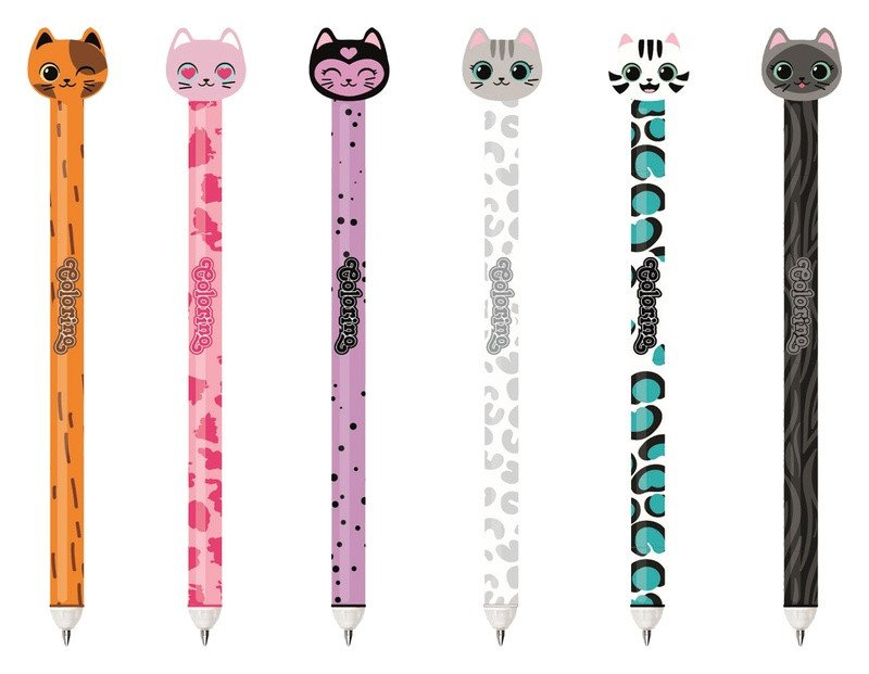Konec chybám a škrtání v sešitech. Prostě je vymaž a přepiš. Pevná pryž na konci pera a jedinečné složení inkoustu zaručuje jednoduché a opakované gumování. K dispozici náhradní náplň.brbrGumovatelná pera s veselou koncovkou ve tvaru kočičí hlavy. Pro zapnutí pera jednoduše zatáhni za ocásek a můžeš se pustit do psaní.