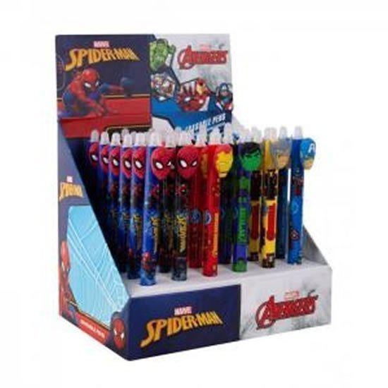 Oblíbená praktická pera se stiskací mechanikou pro školáky - psaní textu bez přepisování. Stačí vygumovat napsaný text a snadno napsat nový. Motivy Spiderman a Avengers v barevném mixu. Barva náplně: modrá.