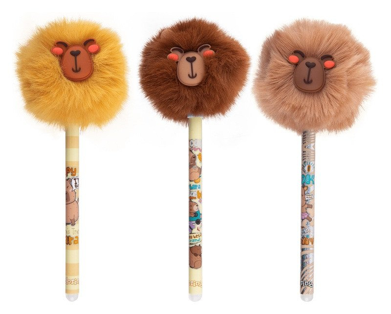 Gumovatelná pera s huňatým víčkem ve tvaru roztomilé kapybary, které je radost pohladit. Barevné kombinace veselých odstínů a metalických motivů na těle, které se skvěle doplňují s celým perem.
